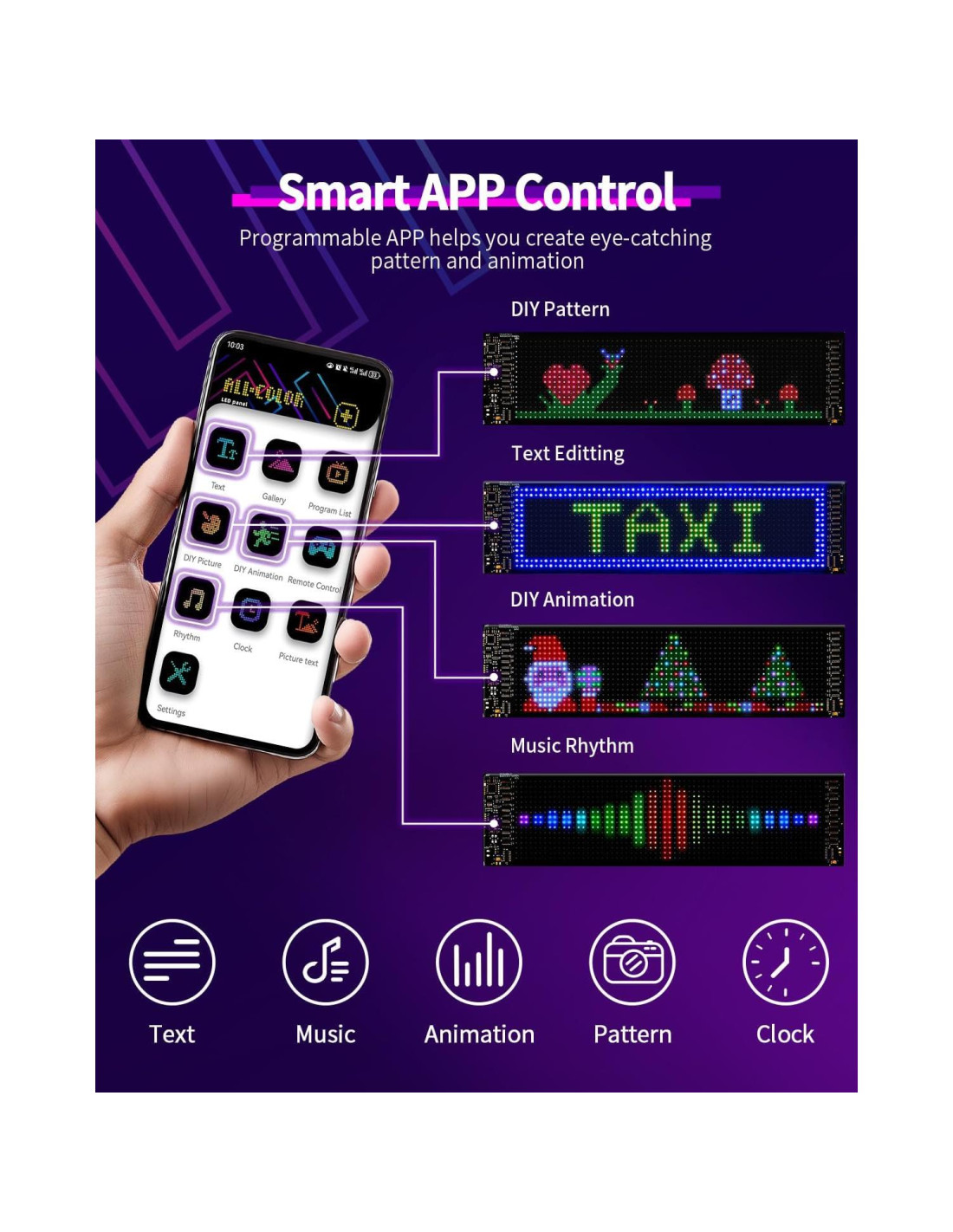 - [DIY con Inspiración]: El panel de matriz LED desplazable te ayuda a usar tu imaginación para crear texto, patrones y animaciones, puedes editar texto para diferentes ocasiones y personalizar patrones estáticos únicos o animaciones dinámicas según tus propias ideas; Es adecuado para cualquier escenario diario, recreativo y comercial, como celebraciones de vacaciones, fiestas, mercados, catering, citas, bodas, jugar juegos y más, puedes guardar estos patrones especiales en la lista de programas para su uso la próxima vez