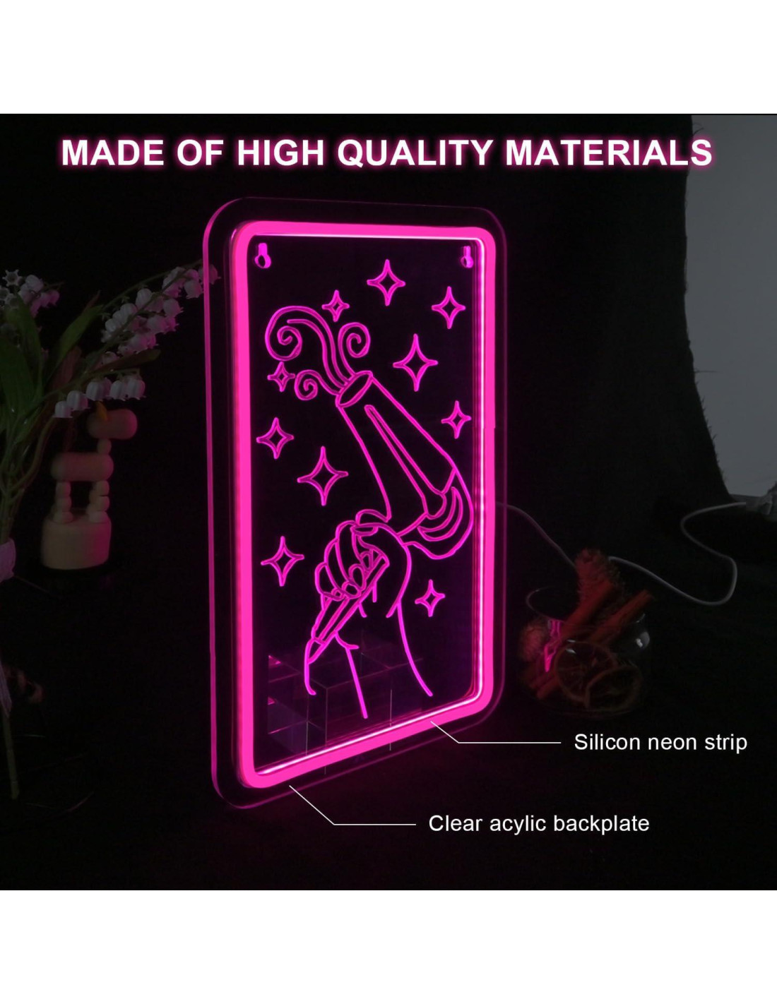 - Elevate Your Space: La escultura de letrero de neón de secador de pelo rosa sirve como un acento decorativo ideal para salones y estudios de estilismo, irradiando tonos ámbar acogedores que cultivan una atmósfera boutique relajante. Nuestra instalación luminosa de letrero de secador de pelo actúa como un centro comercial magnético, distinguiendo su establecimiento de los competidores a través de su estilo artístico.