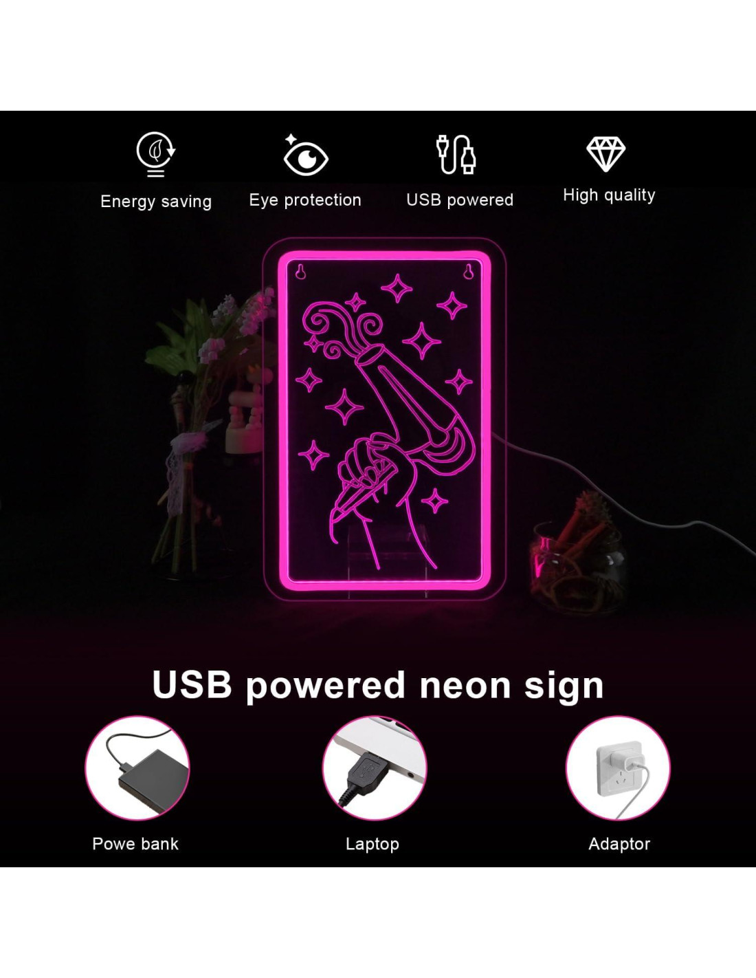 - Operación Simple: El letrero de efecto neón puede ser alimentado por un dispositivo con puerto de carga USB, como hubs de carga USB, computadora. Hay dos ganchos en el paquete para que cuelgues la luz nocturna en las paredes fácilmente. La luz nocturna de neón tiene su propio interruptor independiente, lo que puede evitar la molestia de enchufar y desenchufar con frecuencia.