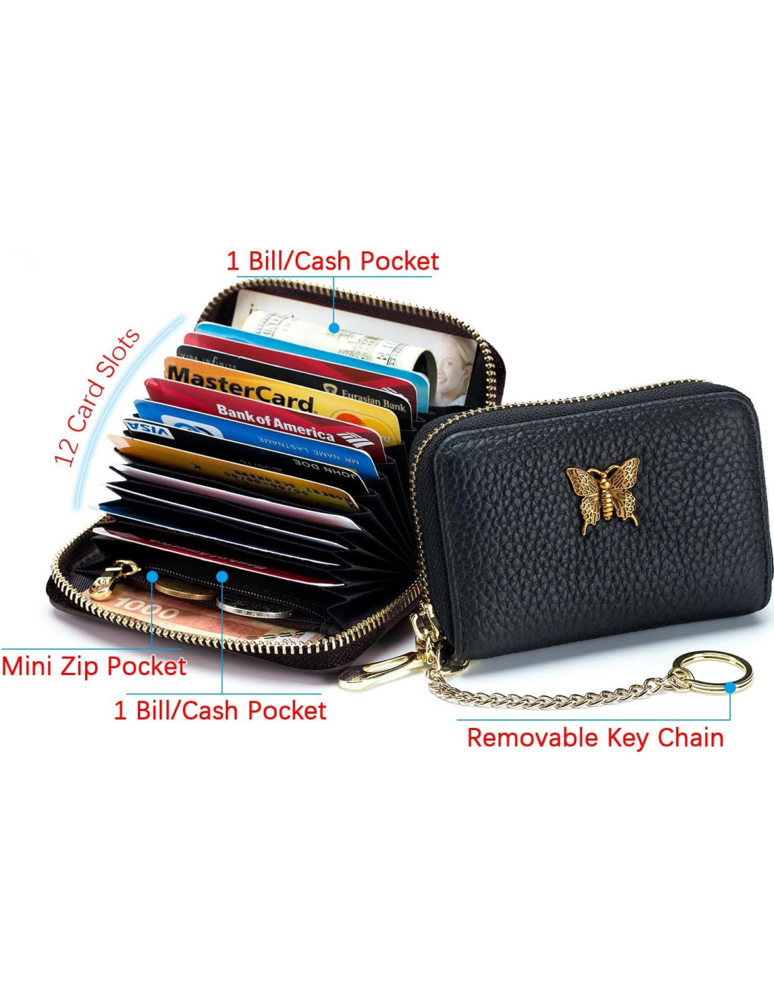 - Gran Capacidad: 12 ranuras para tarjetas + 2 compartimentos para efectivo + 1 bolsillo interior para monedas, que es suficiente para sostener tus llaves y tarjetas diarias, como tarjeta de crédito, tarjeta de débito, tarjeta de presentación, tarjeta de identificación, cheques, licencia de conducir, facturas, recibos, efectivo doblado y más. El llavero extra para llaves y cordones hace que la cartera de tarjetas sea portátil y conveniente.