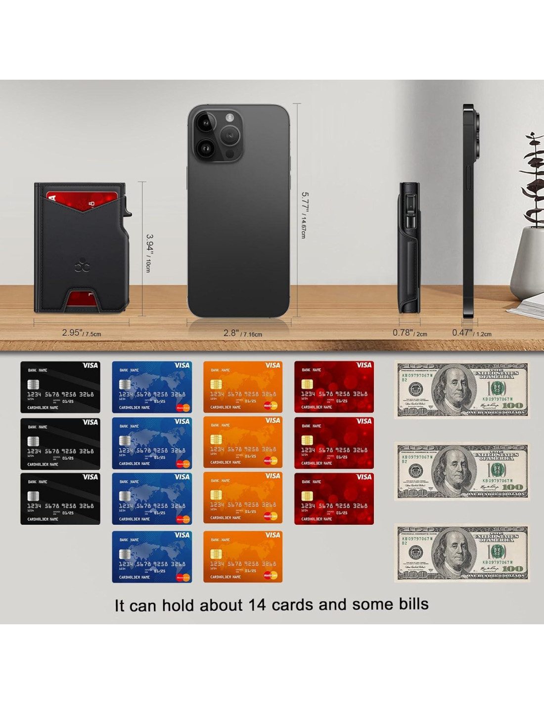 - CUERPO DELGADO CON GRAN CAPACIDAD: Esta billetera delgada para hombres se ajusta fácilmente en el bolsillo delantero, sosteniendo hasta 10 tarjetas (5-7 en el estuche de aluminio, 3 en la cubierta de cuero con ventana para ID), más una ranura para 3 tarjetas más.