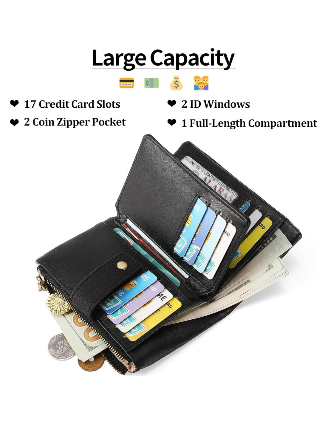 - Diseño Funcional: mide 14.2 x 8.9 x 2.5 centímetros, la cartera para mujeres viene con diecisiete ranuras para tarjetas de crédito y dos ventanas para ID, dos bolsillos con cremallera para redención y un compartimento de longitud completa