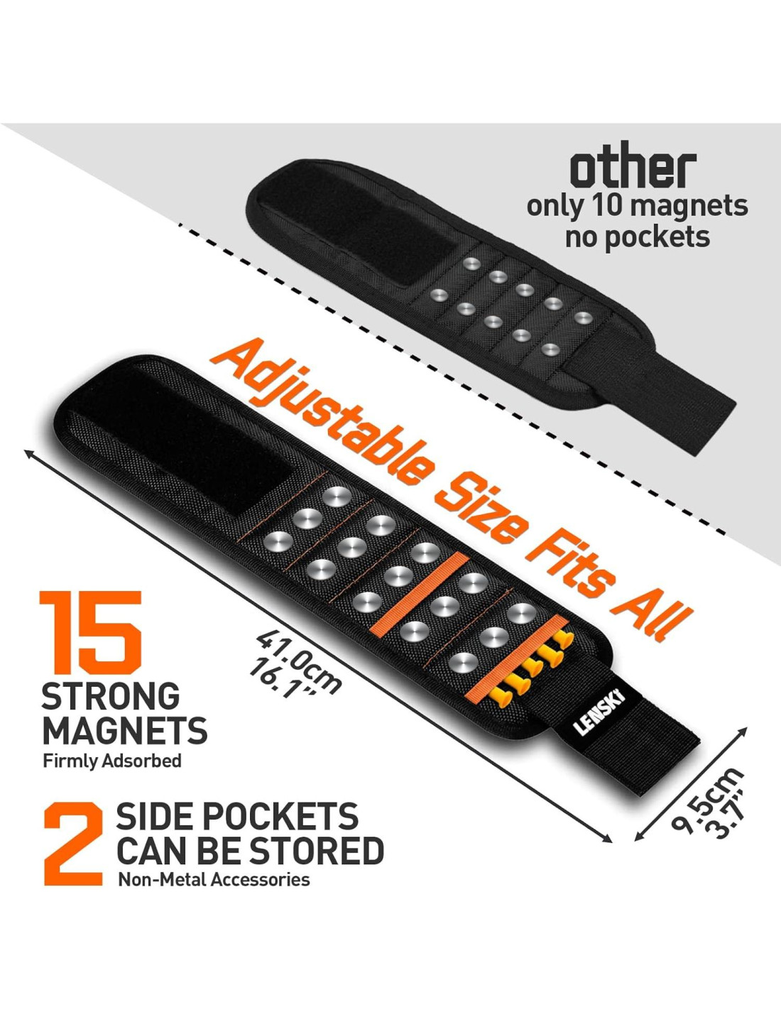 - Herramientas para Hombres - La pulsera magnética Lenski tiene una doble correa de velcro, ajustándola a diferentes tamaños para hombres y mujeres. La red de relleno de punto se utiliza en el área de contacto de la muñeca para mantener nuestra muñeca ventilada y cómoda para trabajar.
