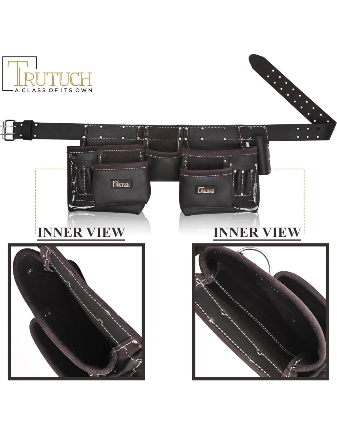 MATERIALES DURADEROS: Las bolsas de herramientas para carpinteros Trutuch son grandes, duraderas y bien organizadas. Esta bolsa de herramientas está hecha de Cuero Genuino y diseñada con el constructor moderno en mente en términos de colocación y estilo. UN BOLSILLO DE HERRAMIENTAS DIGNO: Esta bolsa de herramientas está diseñada con un total de 11 bolsillos, incluyendo 2 bolsillos grandes, 2 medianos y 2 pequeños, 1 cinturón fijo, 2 soportes para martillos. Este es un cinturón de herramientas que sostiene tu martillo lo suficientemente alto para que el mango no golpee la pierna de un constructor cada vez que se da un paso. CINTURÓN ANCHO: Esta bolsa de herramientas viene con cuero de 2.0 - 2.25 mm de grosor. Te sentirás cómodo de inmediato, seguro. Una ranura de túnel deslizante en el cinturón que se puede ajustar fácilmente según sea necesario. El cinturón es ajustable para adaptarse a tamaños de cintura de 73.66 a 116.84 cm. BIEN COSIDO Y RIVETADO: Está hecho de cuero de alta calidad con doble costura y refuerza el soporte adicional. Puntos de estrés y esquinas reforzados con remaches para una durabilidad duradera. Un acabado muy suave con flexibilidad brinda seguridad adicional a tus herramientas. USO PROFESIONAL: Exclusivo, impecable y perfecto para cualquier tipo de trabajo, desde reparaciones domésticas hasta un constructor profesional. Generalmente, estas bolsas de herramientas han sido más populares entre carpinteros, constructores, estructuradores, hombres de manos a la obra, electricistas, colocadores de paneles, constructores, pintores, trabajadores de la madera, plomeros, técnicos y muchos otros. HERRAMIENTAS PARA COLOCAR EN UN BOLSILLO: Las herramientas que lleves en tu bolsillo dependerán de tus preferencias personales y profesionales y, obviamente, del tipo de trabajo que necesites hacer. La mayoría de los bolsillos están diseñados para llevar muchas herramientas, pero eso no significa que debas llenarlo todo. Las herramientas que se pueden agregar a esta bolsa son martillo, cinta métrica, regla, lápices y bolígrafos, escuadra, cinceles, alicates, cuchillo de uso general, clavos y tornillos, brocas, papel de lija, punzones y muchos más. HERRAMIENTAS EXCLUIDAS: Las herramientas no están incluidas en este paquete. Hemos establecido el estándar de calidad en la industria de las bolsas de herramientas. Estas bolsas de herramientas son duraderas, fuertes, elegantes, fáciles de cuidar y resistentes al desgaste. Estamos proporcionando bolsas/pouches/cinturones de herramientas de cuero de lujo exclusivas a precios inigualables. Ranuras segregadas que te ayudan a mantener diferentes herramientas/juegos de clavos por separado en estas bolsas de herramientas. Es una elección perfecta para electricistas, carpinteros, agricultores, plomeros, contratistas, hombres de manos a la obra. Esta bolsa de herramientas está hecha de cuero de grano de alta resistencia. Hilo para hacer nuestra bolsa más resistente y sus dobles costuras evitan la formación de agujeros en el punto de giro y también evitan desgarros. El acabado se refiere a la mejora de la mano y la apariencia de un producto para mejorar su aspecto general y maximizar su potencial de comercialización. Pasamos por nuestras técnicas de acabado mediante pulido, encerado, abrillantado, rociado, texturizado, patentado y curtido con aceite. El contenido de aceite hace que el cuero no solo sea suave y flexible, sino también altamente resistente al agua. Nuestra bolsa de herramientas de cuero curtido con aceite es excepcionalmente duradera, lo que crea un aspecto y sensación natural distintivos con un acabado suave y suave. Así que nuestros clientes pueden disfrutar fácilmente del aspecto clásico, deportivo y moderno de estos accesorios.