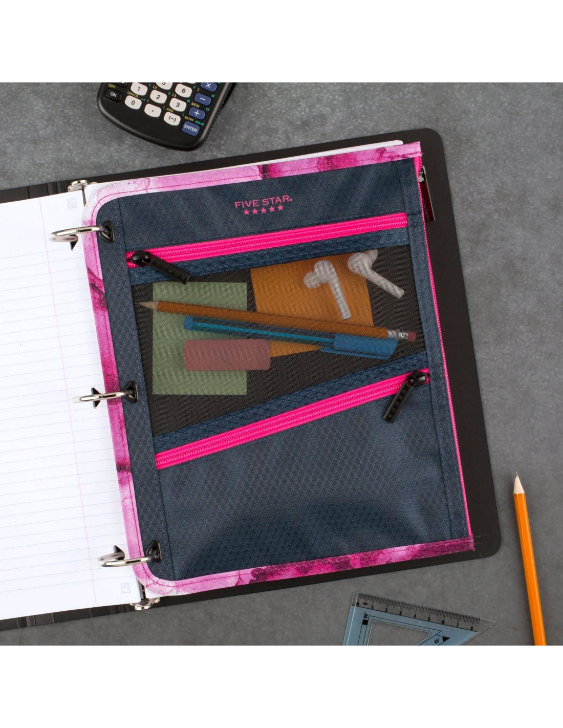 DURA TODO EL AÑO. ¡GARANTIZADO! Almacena y organiza tus suministros más utilizados. El Estuche con Cierre Plano Five Star está hecho con un material de cubierta de poliéster duradero. Tiene 3 bolsillos separados, que proporcionan mucho espacio de almacenamiento y te ayudan a mantenerte organizado. Este estuche es perfecto para bolígrafos, lápices, calculadoras y otros suministros que necesitas para tus clases. Ve rápidamente los suministros dentro del estuche a través del panel de micro-malla resistente a perforaciones. El estuche mide 11" x 9" (27,94 cm x 22,86 cm) y tiene 3 ojales de metal, por lo que puedes guardarlo dentro de tu carpeta de 3 anillas favorita. Disponible en Marino/Rosa. La garantía es válida por un año a partir de la fecha de compra. No cubre el uso indebido. ESTE ARTÍCULO NO ESTÁ DESTINADO PARA USO POR NIÑOS DE 12 AÑOS O MENOS.