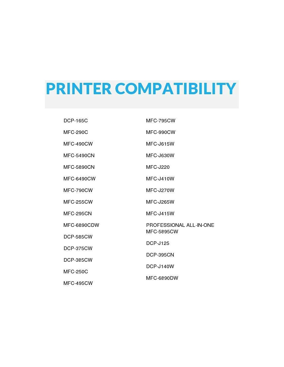 - Para uso en: DCP-165c, DCP-375CW, DCP-385CW, DCP-395CN, DCP-585CW, DCP-J125, DCP-J140W, MFC-250C, MFC-255CW, MFC-290C, MFC-295CN, MFC-490CW, MFC-495CW, MFC-5490CN, MFC-5895cw, MFC-790CW, MFC-795CW, MFC-990CW, MFC-J220, MFC-J265W, MFC-J270W, MFC-J410W, MFC-J415W, MFC-J615W, y MFC-J630W