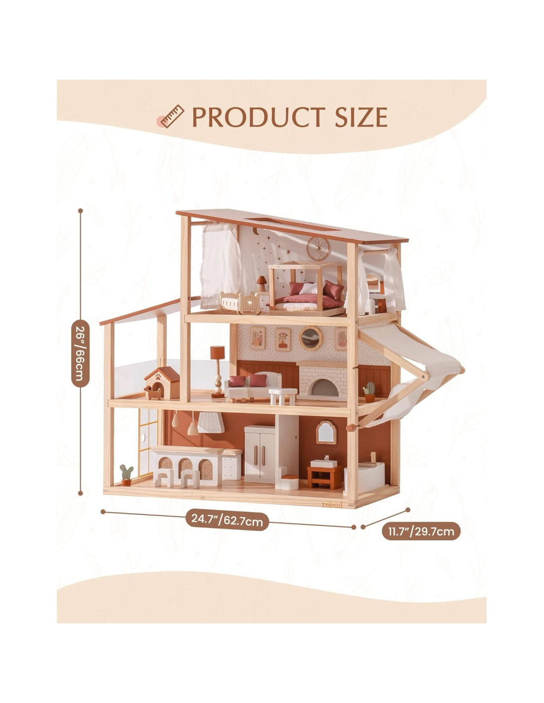 - Diseño Bohemio con Habitaciones Detalladas Esta casa de muñecas de madera ROBUD presenta un estilo bohemio único, completo con colores vibrantes y patrones intrincados. Dentro, los niños descubrirán habitaciones bellamente diseñadas, incluyendo una sala de estar, cocina y dormitorio, fomentando el juego imaginativo.