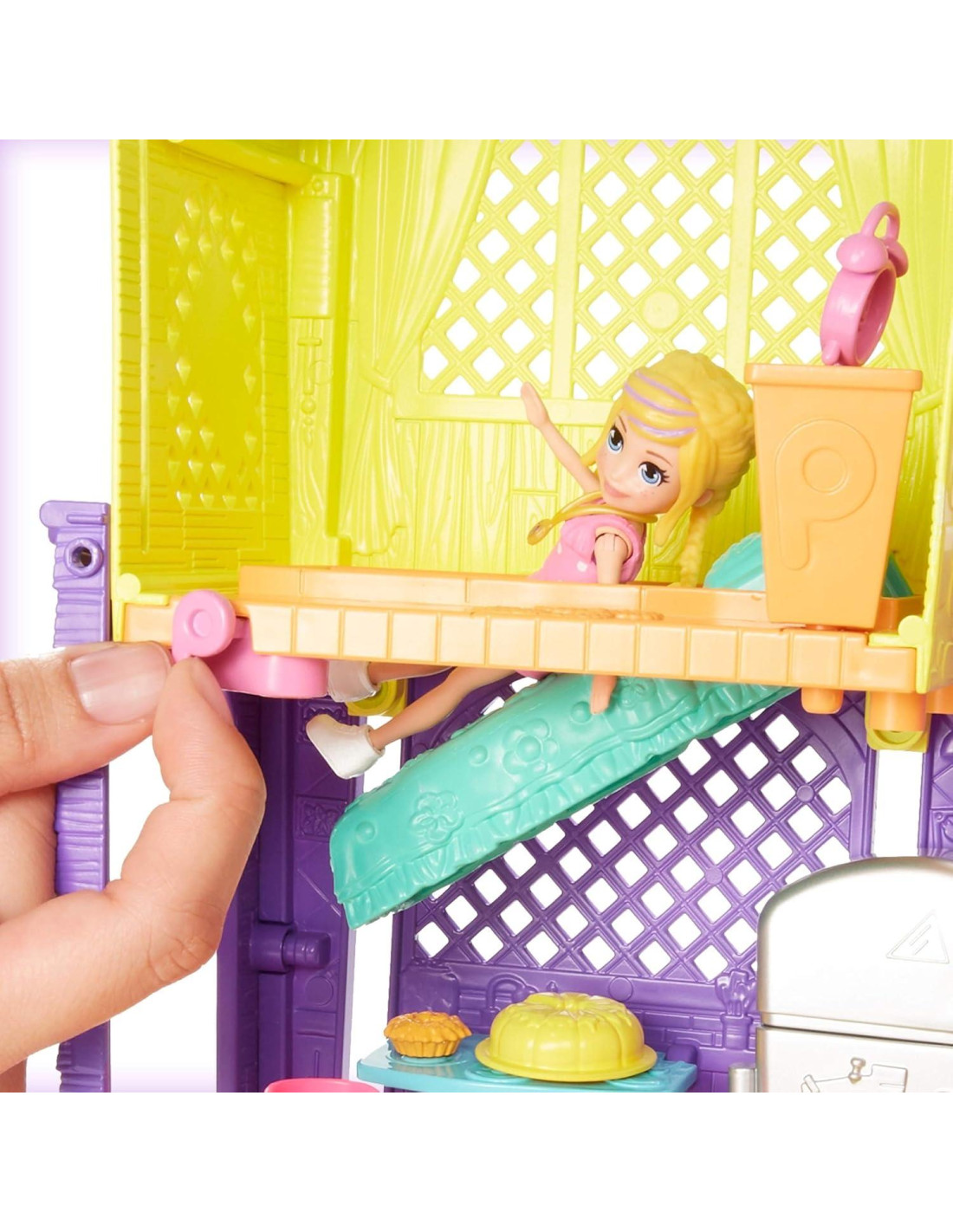- ¡Se abre a 2 niveles de diversión que incluyen un dormitorio para pijamadas, una cocina para preparar cenas y bocadillos deliciosos y un tobogán por el que la muñeca Polly puede deslizarse para salir!