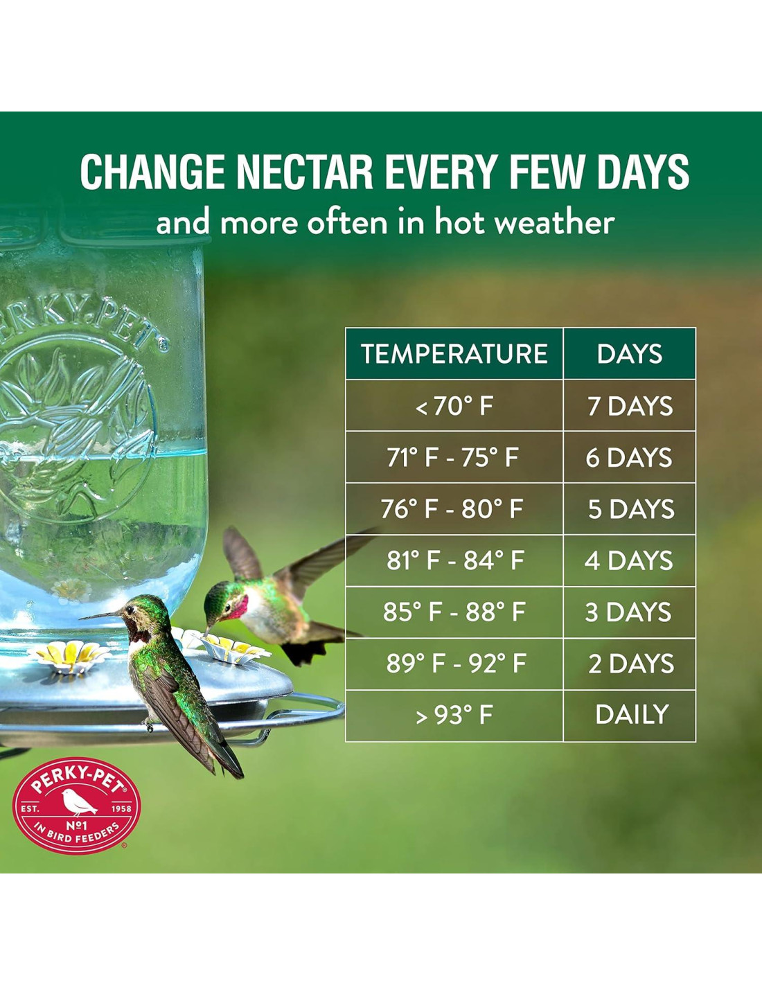 - Gran Capacidad de Néctar - Este alimentador sostiene hasta 32 oz (0,95 L) de néctar, asegurando que tengas la cantidad perfecta de néctar disponible entre limpiezas