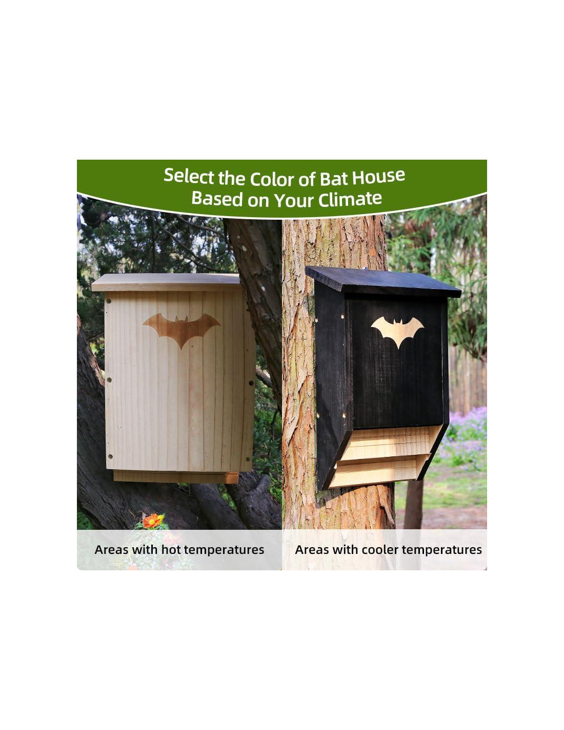 - Preensamblada y Fácil de Instalar: No se requieren herramientas; esta caja de murciélagos preconstruida llega completamente ensamblada con un gancho de soporte resistente y un orificio de montaje preperforado. Instale en minutos en un poste, árbol o pared, al menos a 3.6-4.6 metros de altura, en un lugar soleado y protegido del viento.