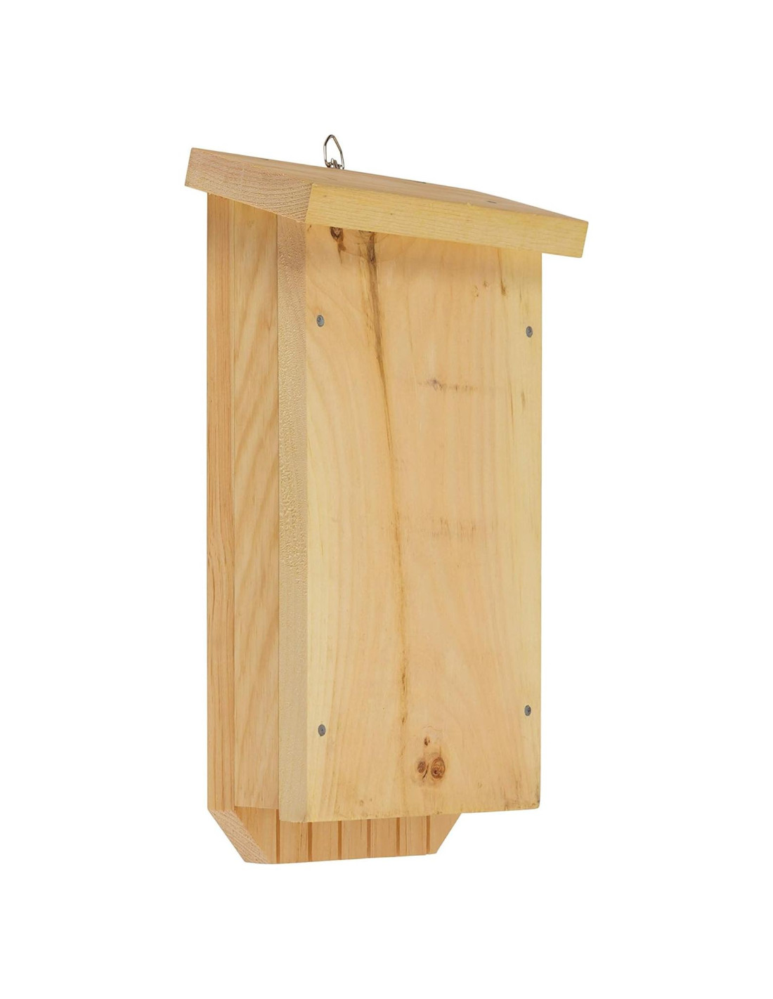 - UBICACIÓN: Cuelga la casa para murciélagos en un edificio o árbol a 10' (3.05 m) a 15' (4.57 m) sobre el suelo y orientada al sur o suroeste. La casa para murciélagos mide 14" (35.56 cm) de alto x 8.5" (21.59 cm) de ancho x 3.5" (8.89 cm) de profundidad