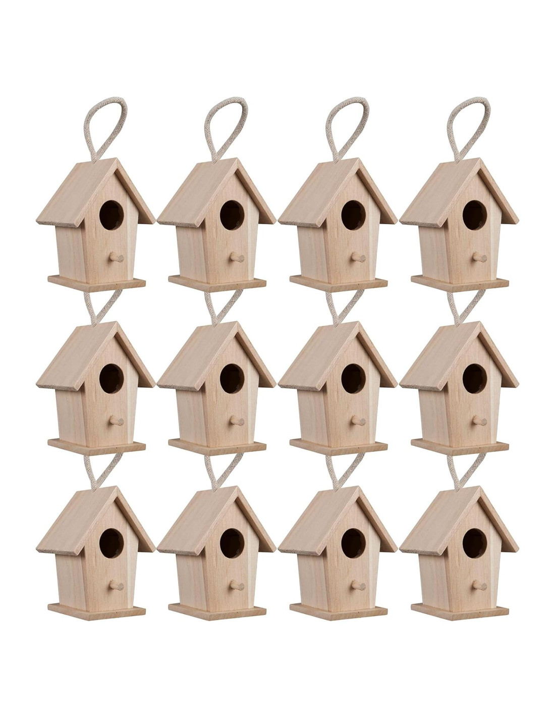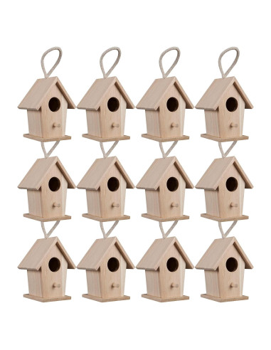 - Sin terminar. Tamaño de la casa de pájaros 4.1" x 3.4" x 2.7" (10.4cm x 8.6cm x 6.8cm). 12 casas de pájaros. Madera de Paulownia y algodón. Cuerda adjunta para colgar.