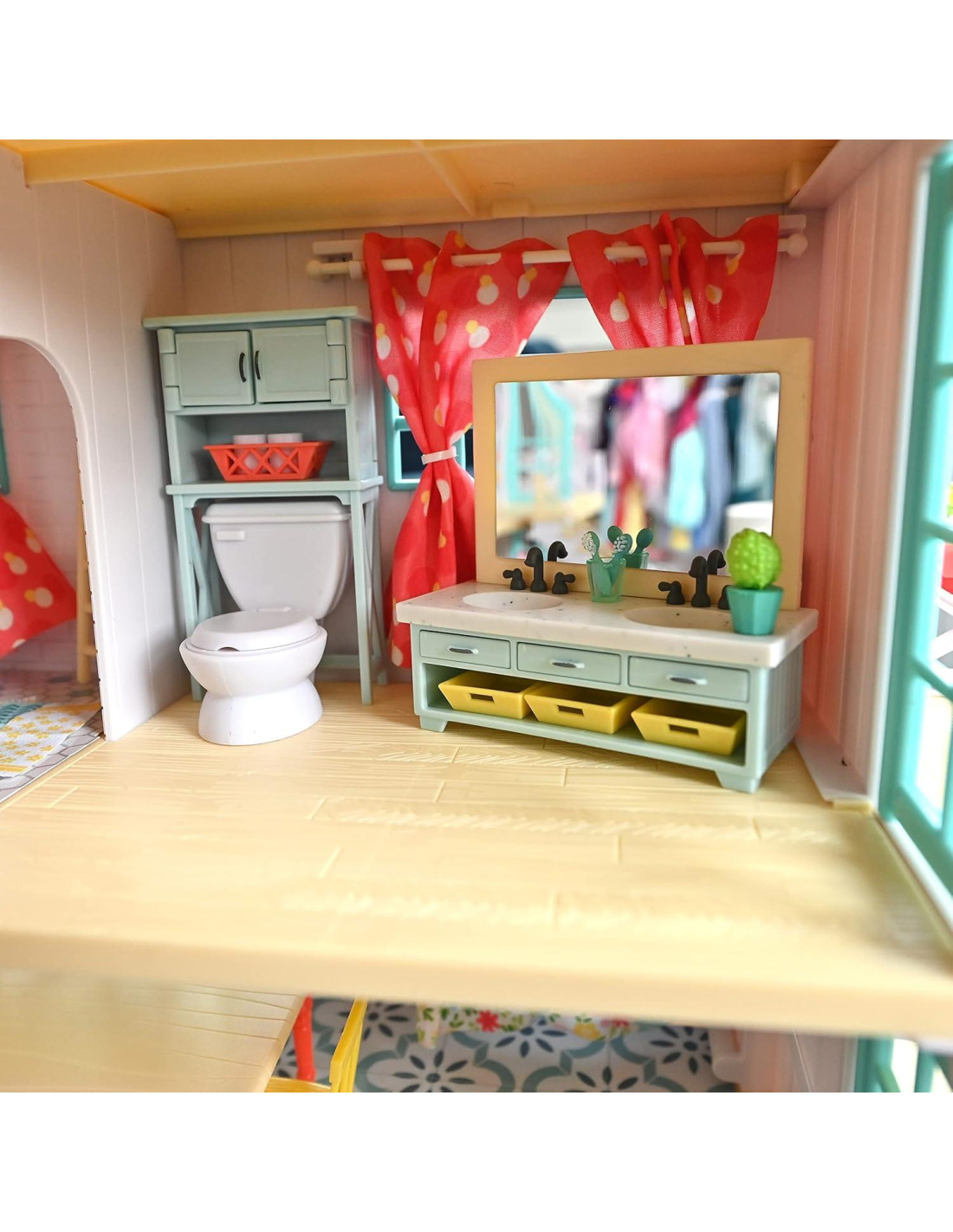 El Baño Bubbly Bee transmite un encanto rústico relajante y moderno en sus telas con estampados florales y el detallado estilo de los muebles. El conjunto también incluye cortinas para adornar la Casa de Campo Buzzby. ¡Es de noche en Honeybee Acres, y es hora de un baño de burbujas! ¡Jabón y chapoteo en la bañera con patas con el patito de goma! ¡Pero no te quedes demasiado tiempo! Los dientes necesitan ser cepillados en el lavabo, y luego es hora de un cuento antes de dormir. Diviértete decorando las habitaciones dentro de la Casa de Campo Buzzby con estas piezas de muebles de baño de casa de muñecas bellamente detalladas y haz que cada día sea un día especial.