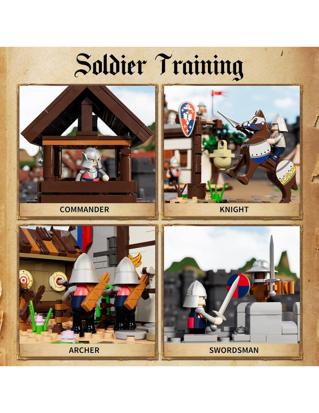 - Experiencia de Entrenamiento Medieval Inmersiva: El campo de entrenamiento de soldados incluye 3 áreas: un objetivo móvil para la lanza del caballero, un área plana para práctica de tiro con arco y desfiles, y un techo para entrenamiento de espadachines. También cuenta con una plataforma de mando para que el comandante supervise toda la escena.