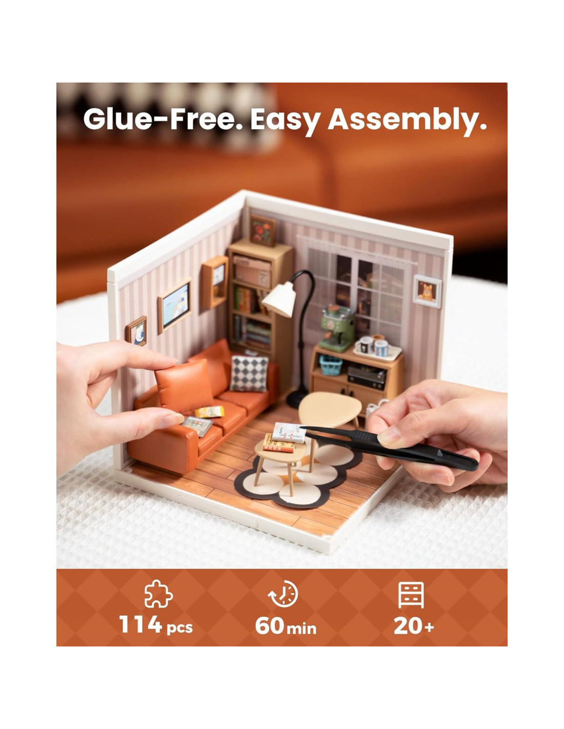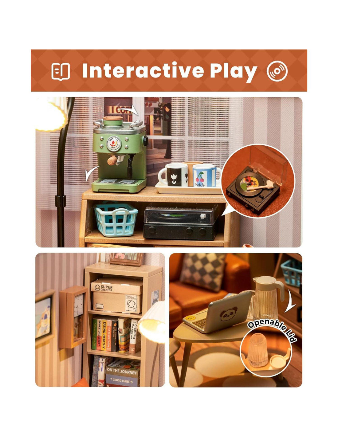 - [Construir Sala de Estar] El kit de miniatura de sala de estar Rolife DIY presenta un cuerpo principal de una habitación con sorprendentes detalles y muebles pre-hechos: una lámpara de pie, un sofá con cojín y bocadillos, una estantería llena de revistas, un reproductor de CD en el armario y otros muebles vívidos.