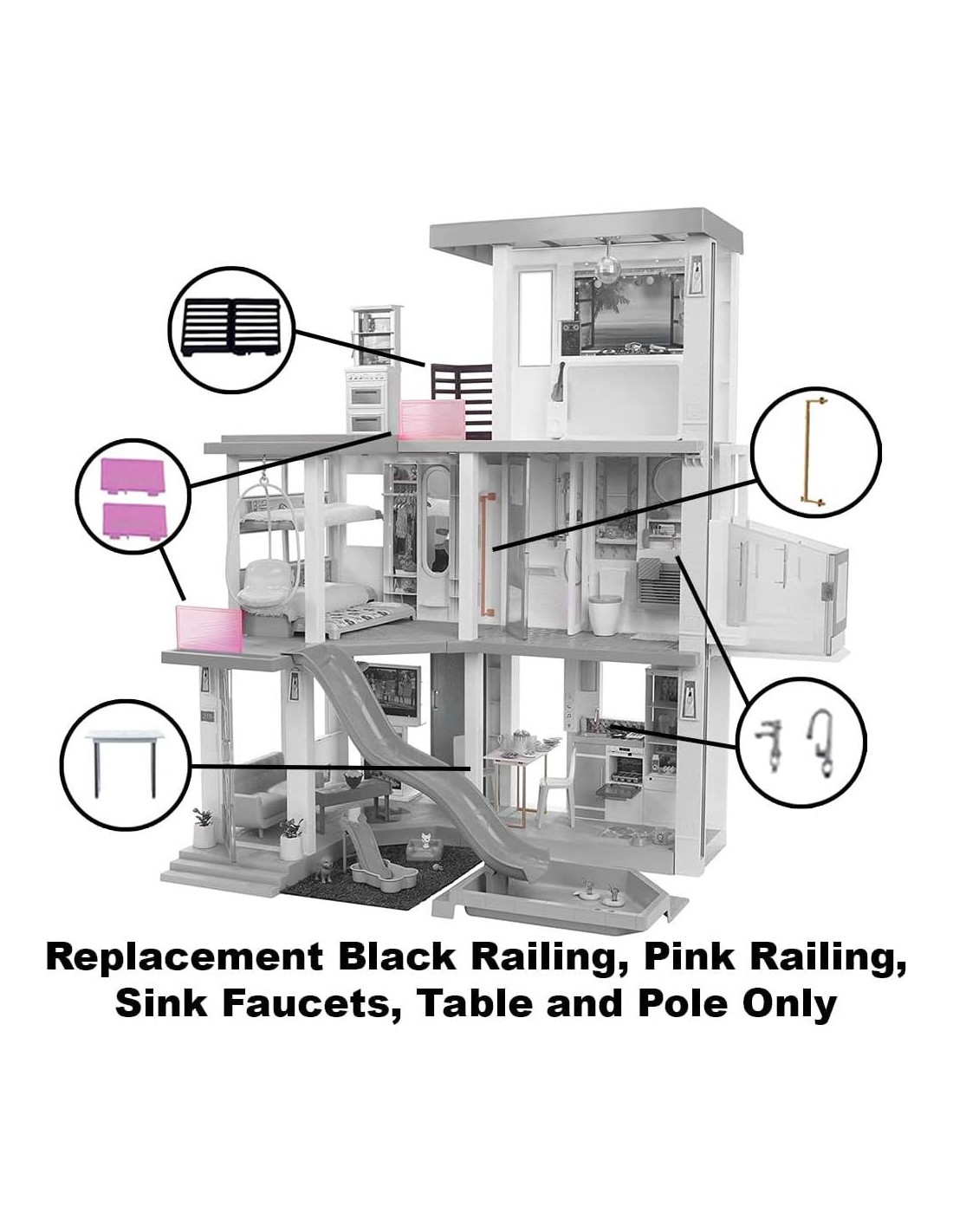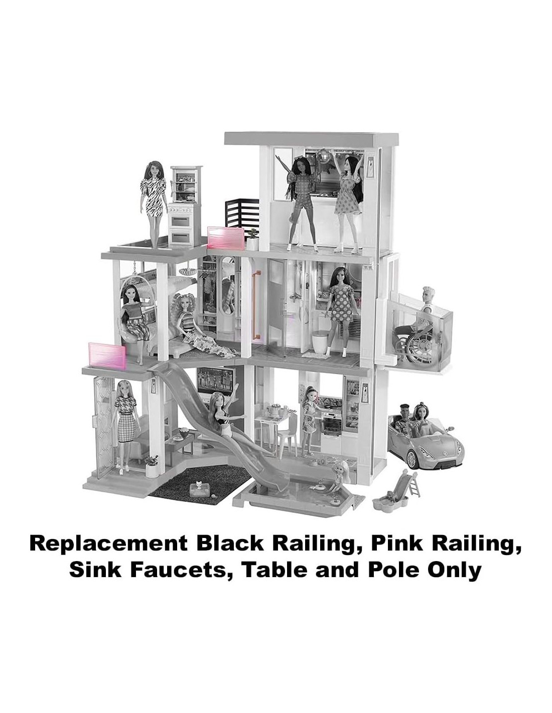 - INCLUYE Barandilla Negra, Barandilla Rosa, Grifos de Fregadero, Mesa y Poste de Barbie