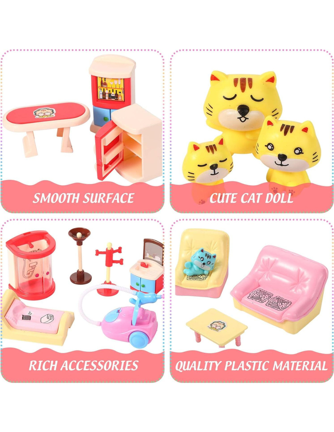 - Divertido Kit de Accesorios para Casa de Muñecas: recibirá 4 conjuntos de pequeños muebles de plástico para casa de muñecas, incluyendo baño, dormitorio, sala de estar y comedor, 8 lindas figuras de gatos y un conjunto de kit de limpieza para casa de muñecas, que son buenas combinaciones para que sus pequeños jueguen y se diviertan mucho