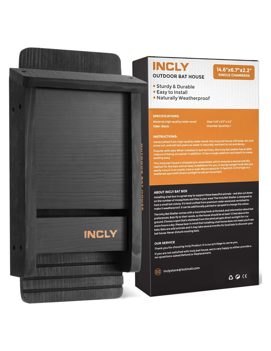 Instalar una caja de refugio para murciélagos en el patio trasero es una excelente manera de demostrar tu compromiso con la naturaleza. ¡Y tus inquilinos murciélagos te recompensarán con maravillosos beneficios! ESPECIFICACIONES: Material: madera de cedro de alta calidad Tamaño: 14.6"x6.7"x2.2" Cantidad de Cámaras: 1 Dónde instalar tu casa para murciélagos El Refugio para Murciélagos Incly viene con un gancho de montaje en la parte posterior, se puede instalar con éxito en bloques de casas urbanas, al borde de caminos, áreas agrícolas o de matorrales. Las cajas deben colocarse lo suficientemente altas en los árboles para prevenir el vandalismo y proteger a los murciélagos de depredadores y eventos de inundación extremos: 8-12 pies (2.5-3.7m) de altura es ideal. Elige un lugar que esté protegido del viento pero que reciba luz solar directa durante 4 o más horas al día. Ten en cuenta que instalar una casa para murciélagos no significa que verás murciélagos. Los murciélagos son animales salvajes y puede tardar varios meses en que los murciélagos locales descubran tu casa para murciélagos. Nunca molestes a los murciélagos en reposo.