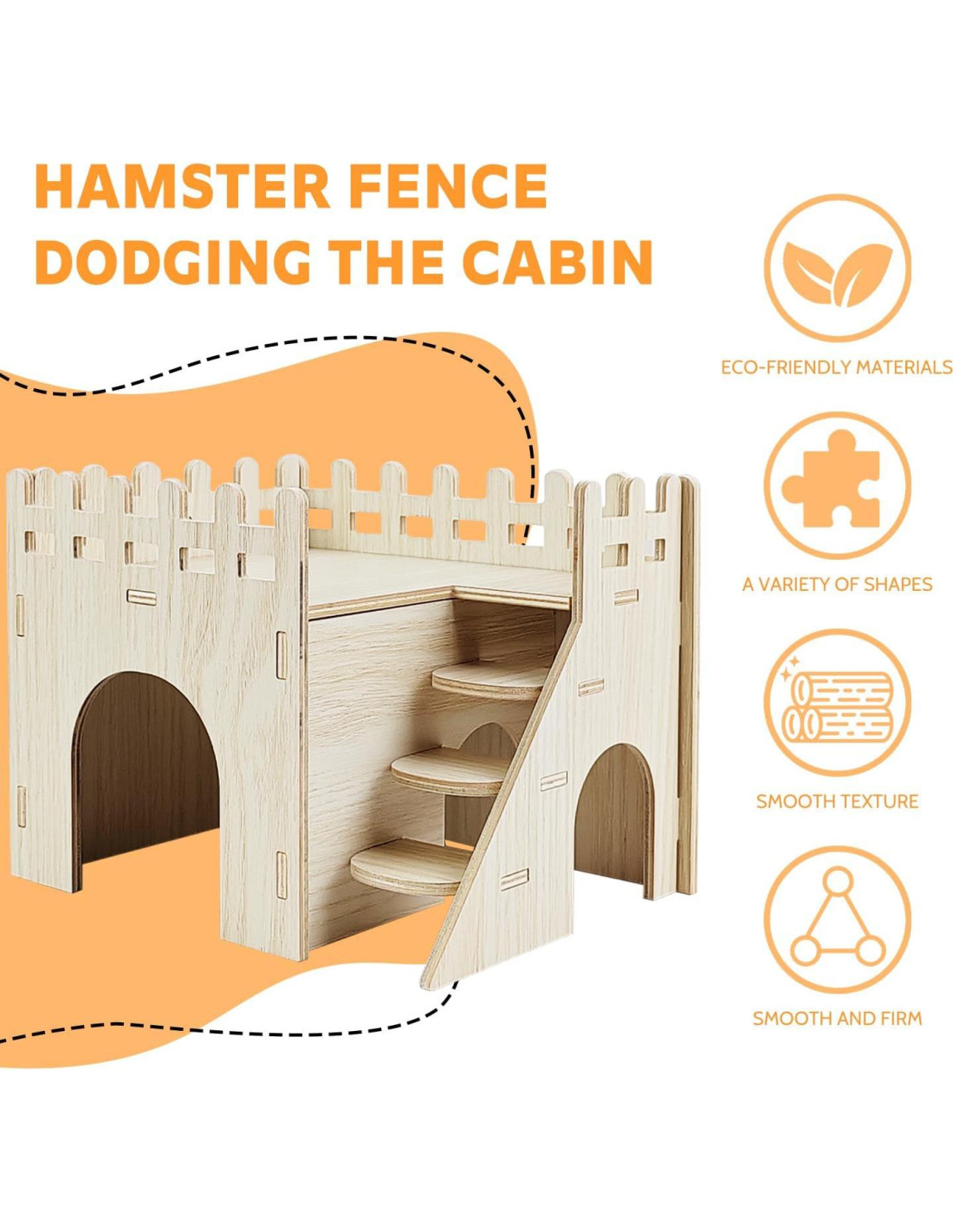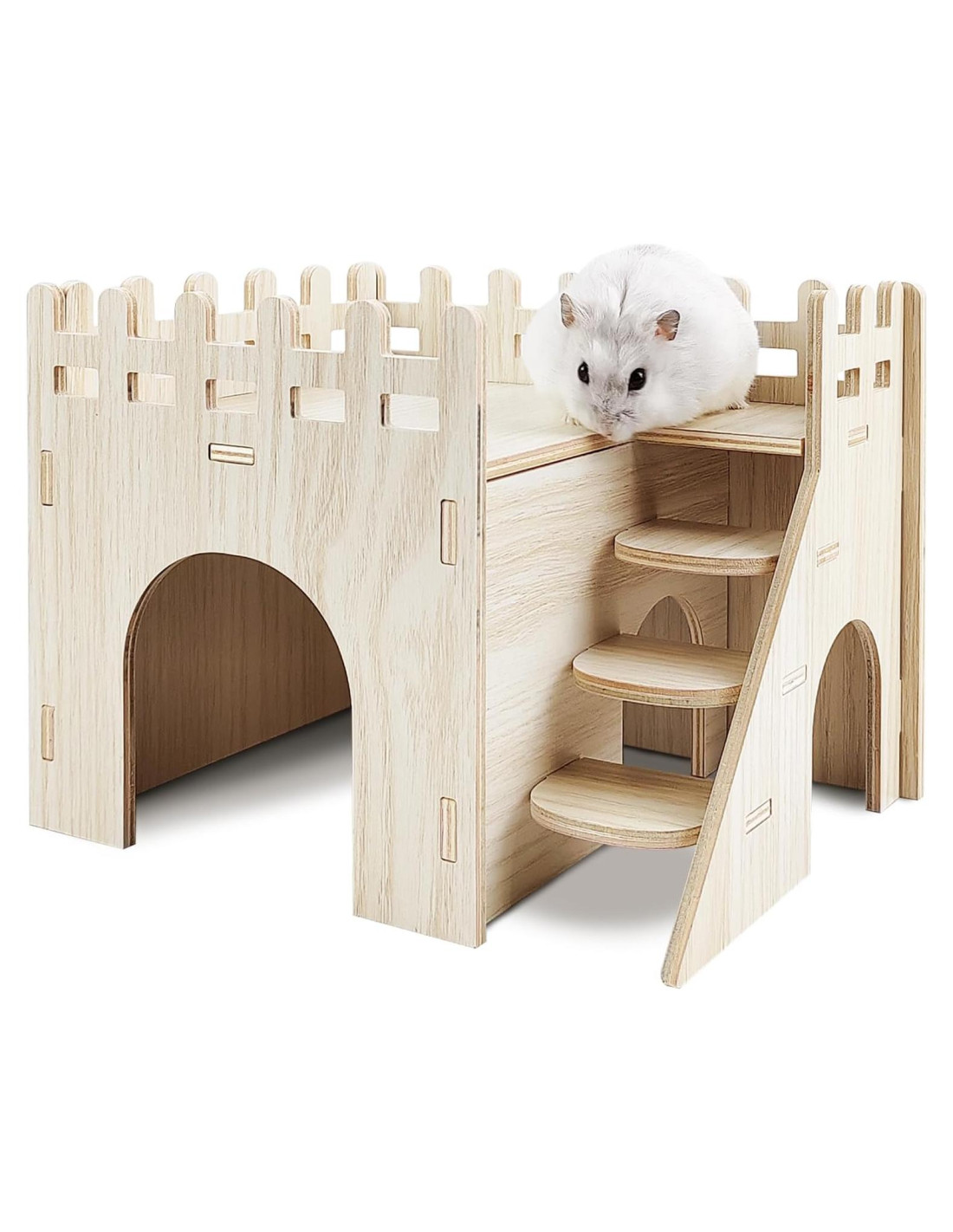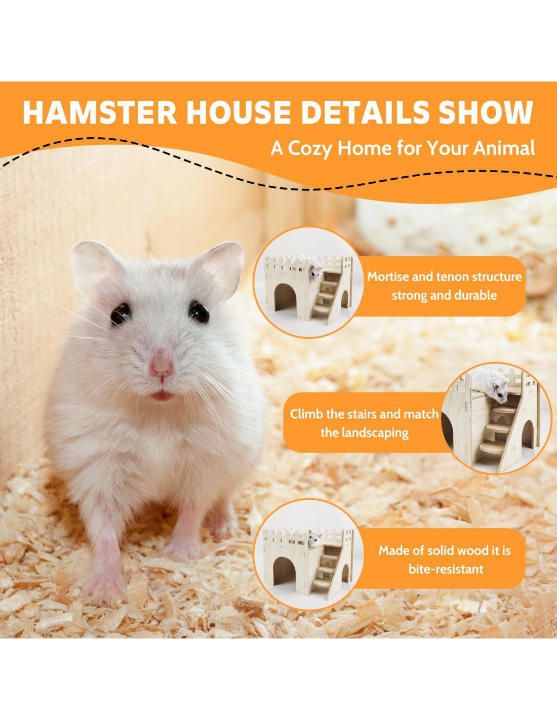 -La casa de hámster de dos pisos tiene mucho espacio para tu querido mascota, un lugar tranquilo para dormir y disfrutar de una vida transpirable y cómoda. -Hecha de madera segura, pulida suavemente en cada esquina, no tóxica y inofensiva para las mascotas. Puedes dejar que tus amigos peludos disfruten de sus escondites sin que les ocurra ningún daño. -Diseño de múltiples cuevas, escalera del castillo de hámster con cuevas, conveniente para que los hámsters se escondan cuando se asustan en la casa, pero también para proporcionar buenas condiciones de ventilación, para que puedan caminar con tranquilidad. También hay escaleras para facilitar el movimiento de los hámsters, y el techo del hogar también se puede usar como plataforma para que los hámsters jueguen o exploren.