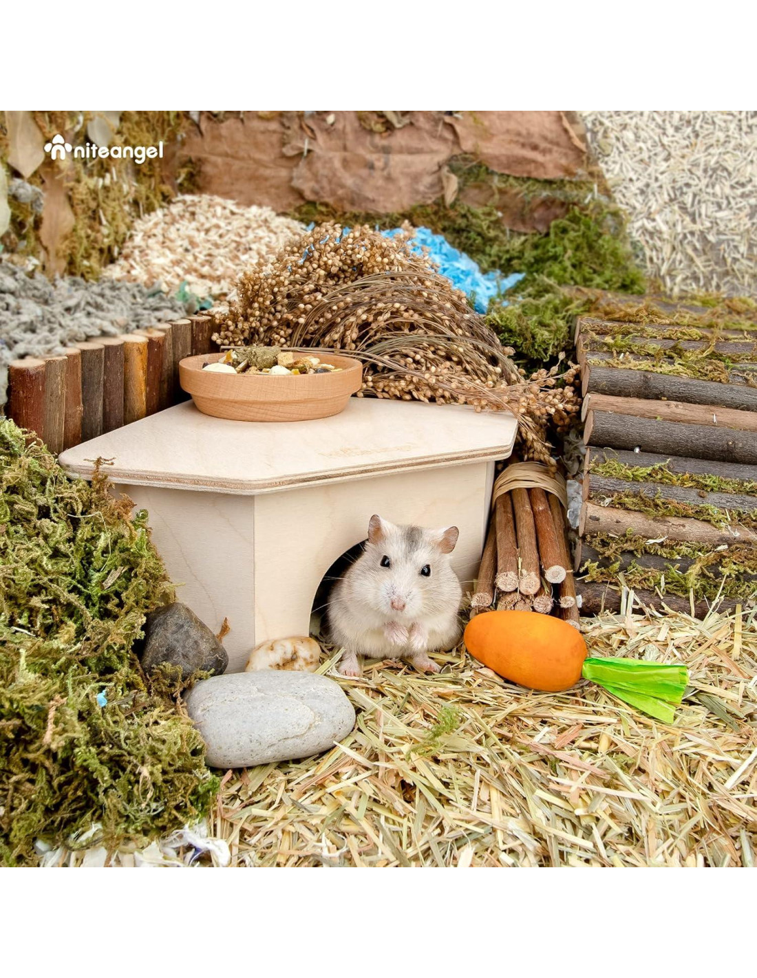 - Material Hecho a Mano y Amigable para Mascotas - Hecho a mano con contrachapado de abedul seleccionado y palos de haya sin clavos, toda la estructura es robusta y no hay huecos en las escaleras de escalada del techo. Cada esquina de esta casa para hámster está lijada suavemente, lo que te brinda una casa y juguete para hámster duradera y masticable, ayuda a aliviar su deseo de masticar y protege los dientes de la mascota.