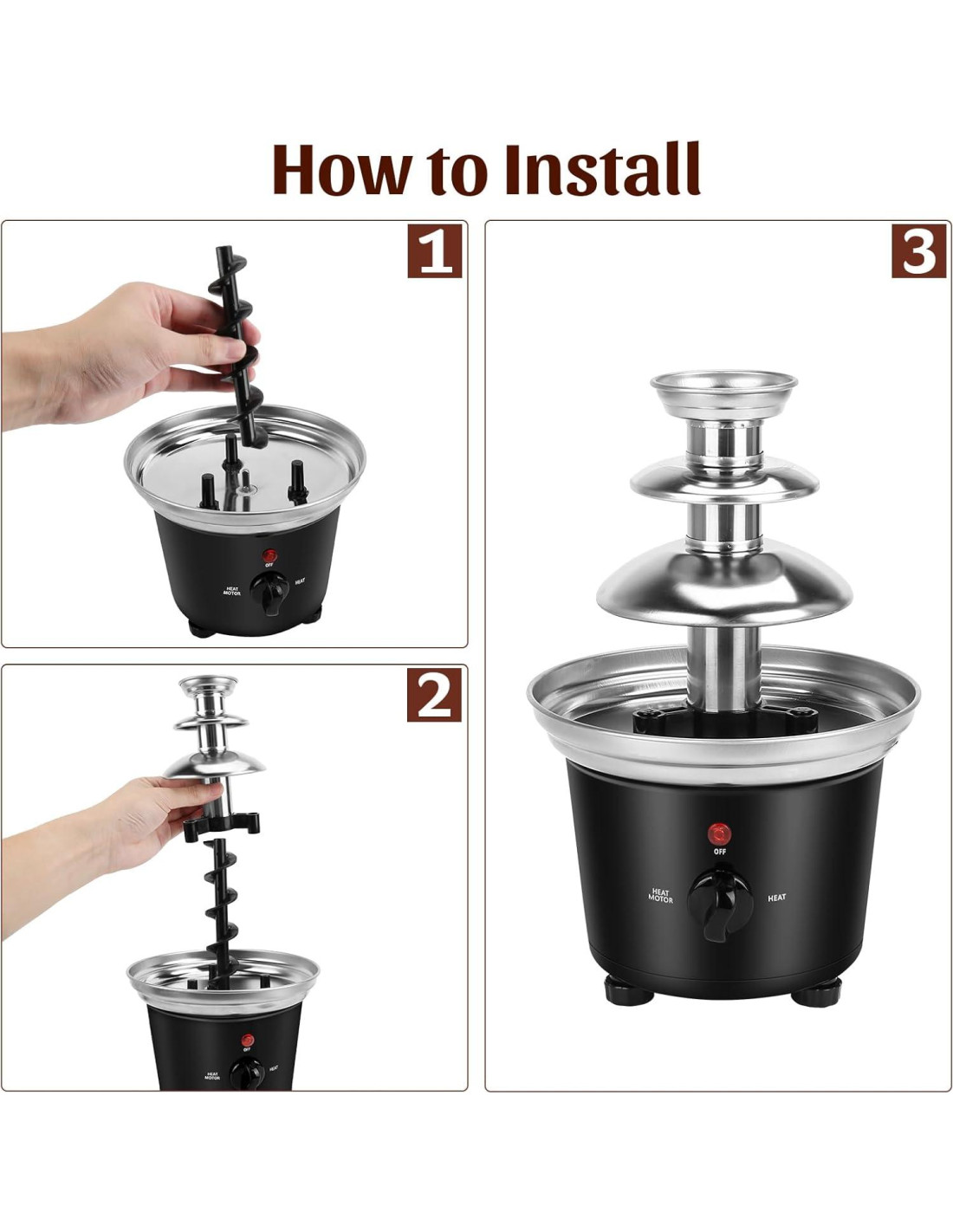 - SALUD Y SEGURIDAD: La fuente de chocolate está hecha de una base de acero inoxidable de grado alimenticio y un diseño en niveles, libre de BPA. La Máquina de Fuente de Fondue de Chocolate puede estar en contacto directo con los alimentos para garantizar la seguridad y la higiene. Por favor, limpie la base de acero inoxidable y limpie la bandeja antes de usar.