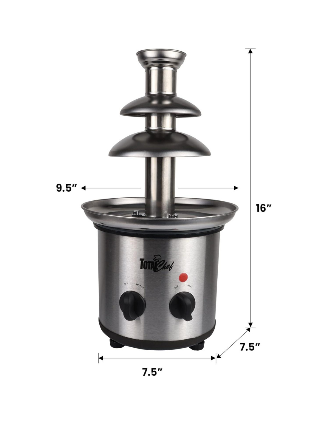 La Fuente de Chocolate de 3 Niveles Total Chef es una adición divertida y elegante a cualquier fiesta que seguramente deleitará e impresionará a sus invitados de todas las edades. Esta fuente autocalentable acomoda hasta 1.5 libras de chocolate (680 gramos). Solo agregue un plato de bayas, frutas de temporada frescas, malvaviscos y galletas para un postre delicioso y sin esfuerzo. Con funciones de calefacción y motor separadas, puede asegurarse de que el chocolate esté completamente derretido antes de iniciar el motor para el efecto de fuente. El dial de temperatura ajustable le permite seleccionar el nivel de calefacción que se adapte a sus necesidades y el sistema de tornillo sin fin previene atascos y mantiene un flujo uniforme. El tazón y los niveles de acero inoxidable se retiran fácilmente sin necesidad de herramientas para una limpieza sencilla y la protección contra goteos incorporada protege su mesa de derrames.