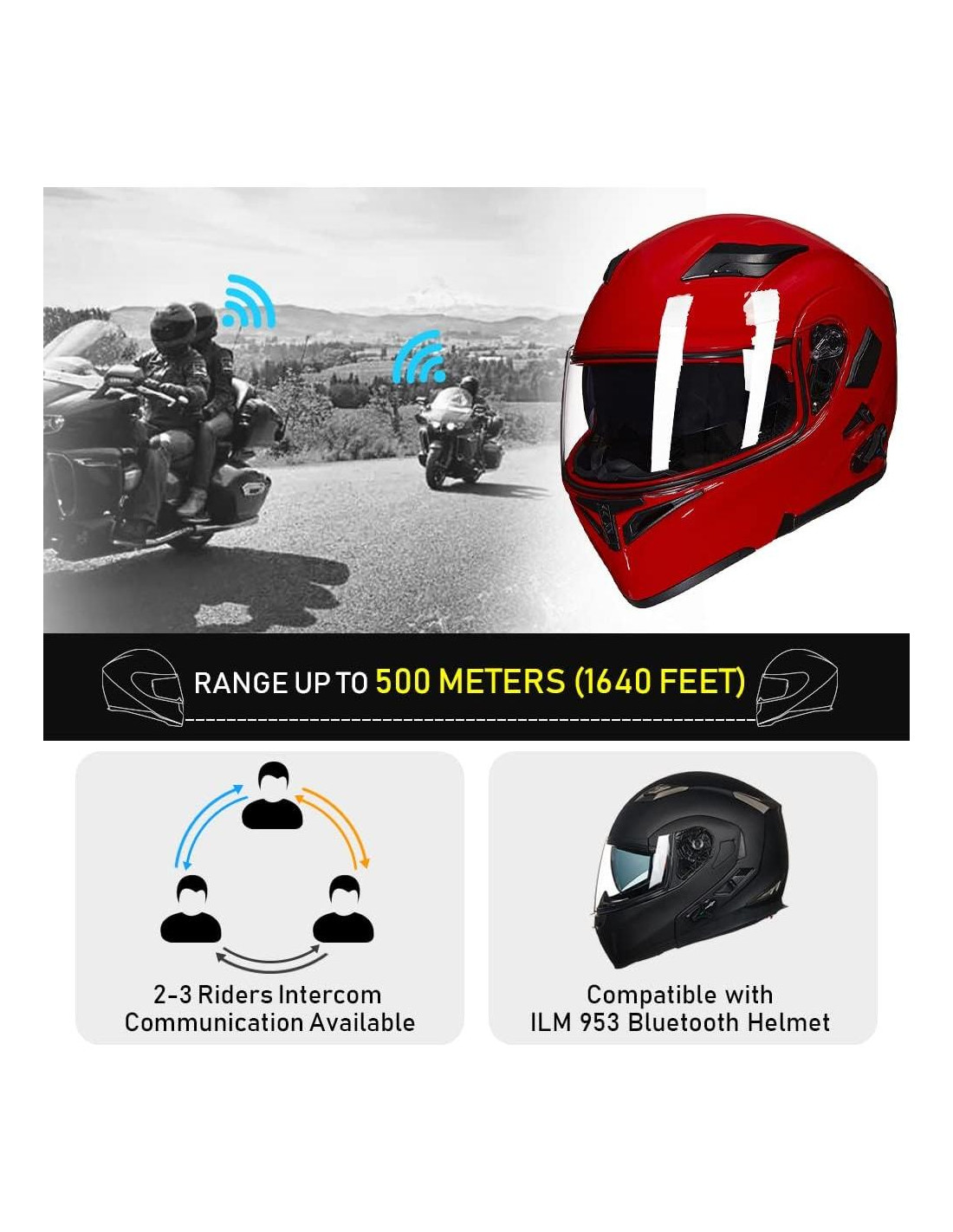 - Con sistema de intercomunicador, los cascos de motocicleta soportan emparejamiento de 3 motociclistas, comunicación de 2 motociclistas en intercomunicador al mismo tiempo con una distancia máxima de hasta 500 Metros (1640 Pies).