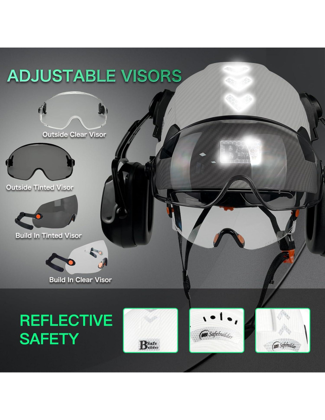 - [Accesorios de SAFEBUILDER] Los cascos de seguridad de la marca SAFEBUILDER soportan orejeras montadas para obtener protección auditiva, visera de seguridad instalada dentro y fuera de la carcasa del casco, visera clara y visera tintada para opciones que ayudan a los trabajadores a obtener una visión clara en el trabajo diario o por la noche. Elige Safebuilder, elige un conjunto completo de protección para la cabeza.