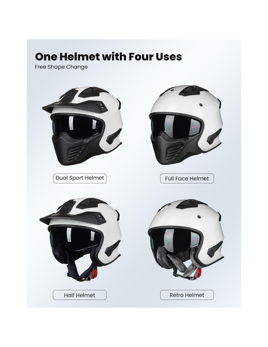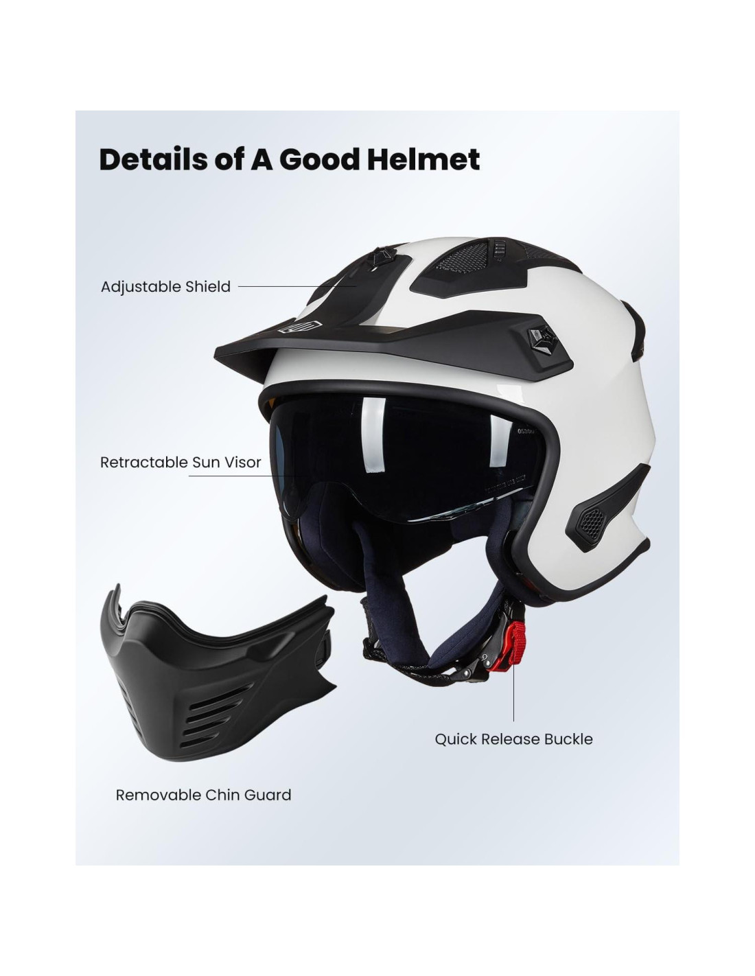 - Casco de motocicleta abierto 3/4 se ajusta a hombres y mujeres. Ideal para ATV, UTV, MTB, Dirt Bike, Motocross, Street Bike, Cruiser, Scooter, Moped y otros deportes al aire libre.