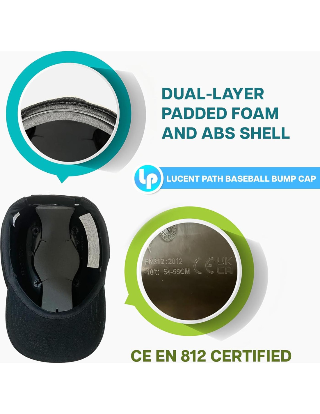 - Certificado para Seguridad: El casco de seguridad bump cap de béisbol Lucent Path cumple con las normas europeas CE EN 812, asegurando una protección confiable contra golpes accidentales en la cabeza. No está aprobado por ANSI porque ANSI no tiene un estándar específico para los bump caps.
