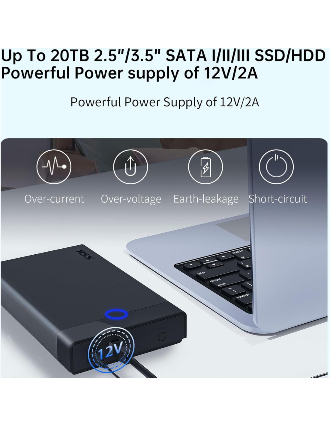 - Carcasa de Disco Duro de 3.5/2.5: La carcasa de disco duro SSK para laptop está especialmente diseñada para HDD/SSD SATA de 3.5/2.5 pulgadas con un grosor de 30mm. Esta carcasa de disco duro USB soporta hasta 20TB de almacenamiento portátil y conecta fácilmente su disco externo de 3.5/2.5 a PCs, laptops y otros dispositivos para una protección integral de sus valiosos datos
