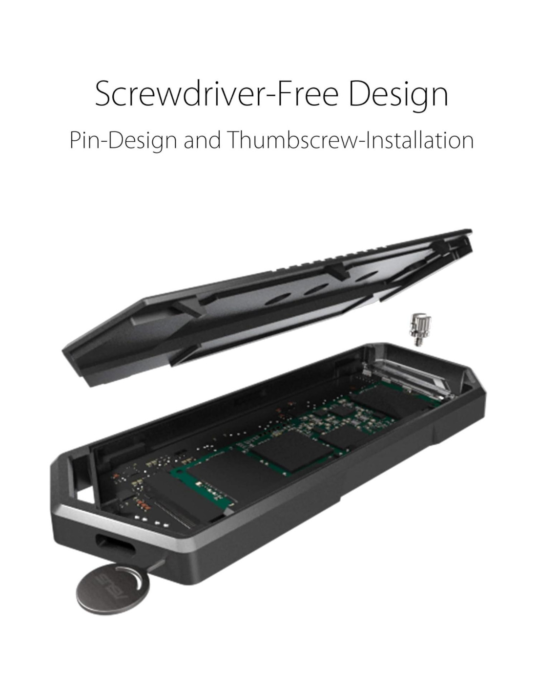 La caja para SSD ASUS ROG Strix Arion M 2 PCIe NVM Express soporta unidades con factor de forma 2230/2242/2260/2280 con velocidades de transferencia de datos de hasta 10 Gbps. El diseño sin tornillos proporciona una fácil instalación, mientras que las almohadillas térmicas incluidas y la caja de aluminio personalizada ROG disipan el calor de tu unidad M 2 manteniendo a Arion fresco bajo presión.