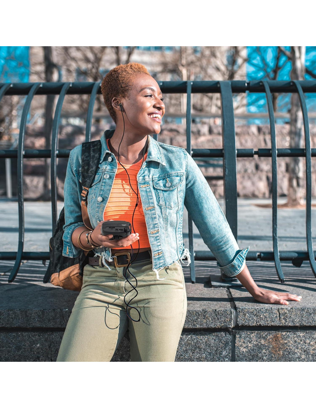 - Incluye un juego de auriculares estéreo y clip de cinturón desmontable