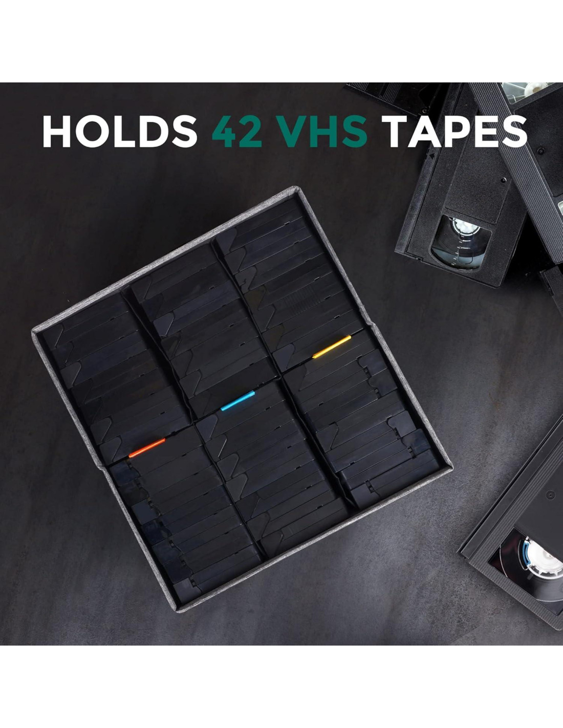 - [Gran capacidad] El contenedor de almacenamiento VHS TWAVETREE tiene seis divisores, una caja puede almacenar 42 cintas VHS, en comparación con otros productos similares, la capacidad es enorme. La caja de almacenamiento de cintas de video con tapa está diseñada para ser apilable, por lo que es una buena idea comprar múltiples cajas para ahorrar aún más espacio.