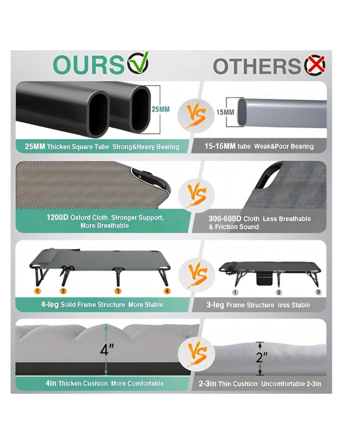- Materiales Premium: Esta cama plegable para adultos cuenta con un robusto marco de acero cuadrado anti-óxido de 25mm y tubería de 1mm de grosor, asegurando fuerza y soporte. Cubierta con tela Oxford 1200D duradera, resistente al sol y transpirable, proporciona un sueño cómodo. El marco de tubo cuadrado completo de la cama y los pies en forma de U mejoran la estabilidad, mientras que su capacidad de peso de 150 kg asegura durabilidad y comodidad, haciéndola ideal para actividades al aire libre y uso por invitados.