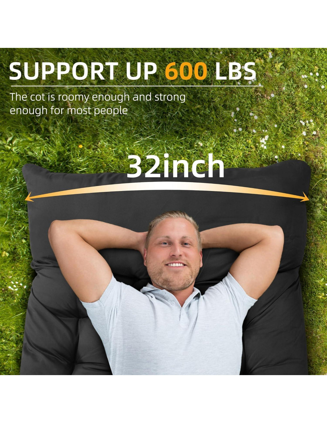 - Cama de Camping con Colchón: La cama de camping viene con un colchón extraíble de 6.4 cm-7.6 cm de grosor con una superficie de terciopelo, proporcionando un sueño cómodo y transpirable. El colchón de la cama se puede fijar a la cama de campamento para evitar que se mueva al usarla, y se puede enrollar para facilitar el transporte y almacenamiento. NOTA: El colchón está empaquetado a presión, por favor amasa el colchón repetidamente y déjalo durante varias horas para que se esponje.