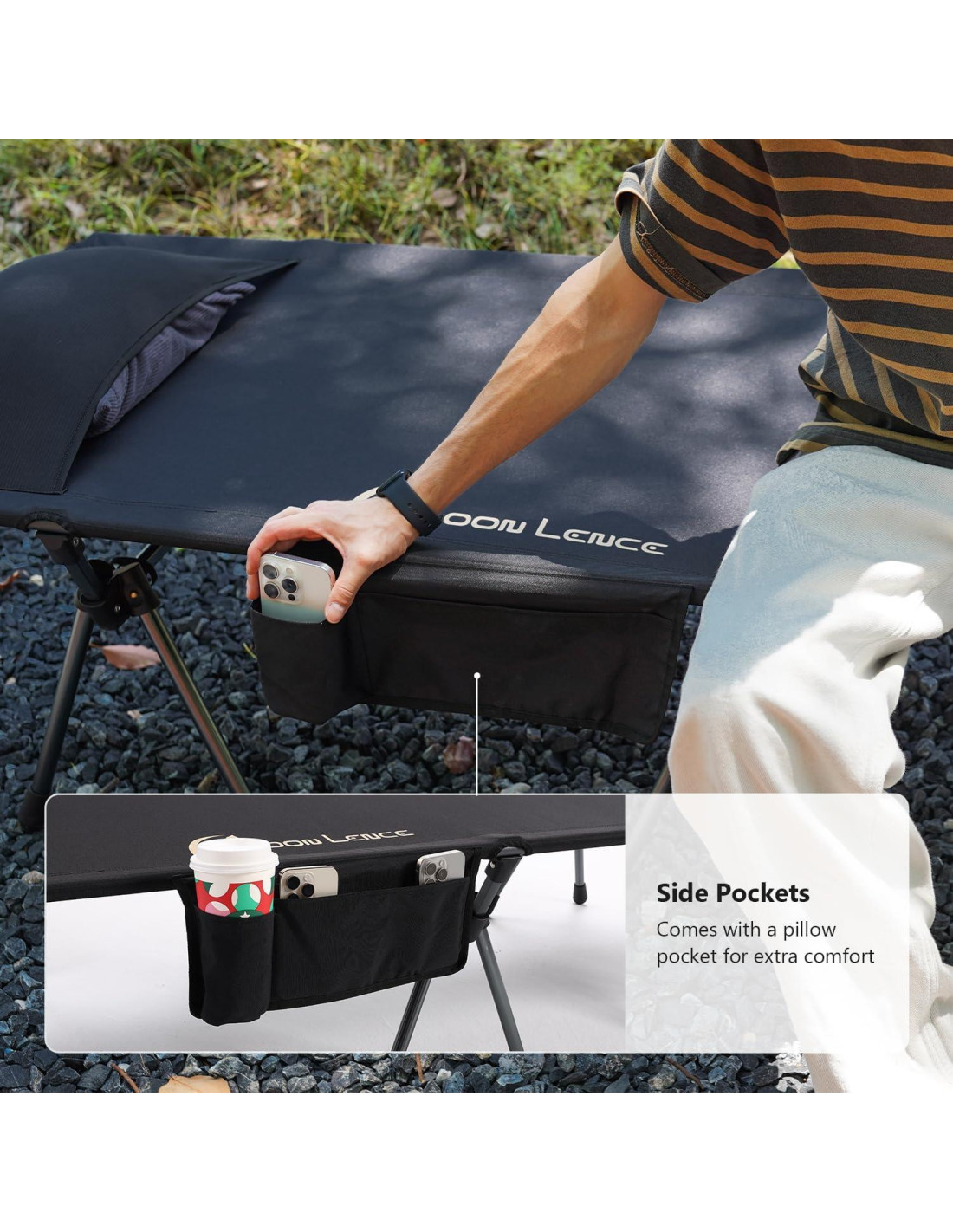 - [Almacenamiento Inteligente] : Su bolsillo lateral puede mantener esenciales (teléfono/batería portátil/aperitivos) al alcance. El extremo de la cabeza de esta cama de camping puede colgar una bolsa de almacenamiento, para que puedas guardar artículos como ropa dentro en lugar de dejarlos en el suelo.
