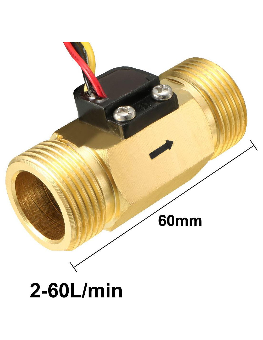 1. El sensor de flujo de agua es ligero, de contorno ágil, pequeño y fácil de instalar. Todos los materiales cumplen con los estándares de prueba SGS. 2. Hay un sensor de efecto Hall integrado que emite un pulso eléctrico con cada revolución. El sensor de efecto Hall está sellado del tubo de agua y permite que el sensor se mantenga seguro y seco. 3. Estable, alta temperatura, inicio a baja presión de agua. 4. Puede usarse para calentadores de agua, máquinas de tarjetas de crédito, máquinas expendedoras de agua, dispositivo de medición de flujo. 5. Conexión de tres cables: rojo para positivo, negro para negativo, amarillo para señal de pulso. Especificaciones: Nombre del producto: Sensor de flujo de agua Material: Latón (carcasa) Temperatura del líquido: No más de 60C Diámetro de rosca externa: G3/4 Rango de flujo: 2-45L/min Voltaje de trabajo: DC5V Corriente máxima: 10mA Presión máxima de agua: 1.75MPa Conector: Macho SM-3P Longitud del cable: 35cm Tamaño: 60mm x 30mm x 31mm (L*W*H) Clasificación de protección contra ingreso: IP65 Color: Tono de latón Peso neto: 152g Paquete incluido: 1 x Sensor de flujo de agua Nota: 1. Instalado de acuerdo con la dirección de flujo en el producto, de lo contrario no hay salida de señal. 2. Se debe instalar una pantalla de filtro en la entrada del sensor, para evitar que partículas y escombros entren en el sensor.