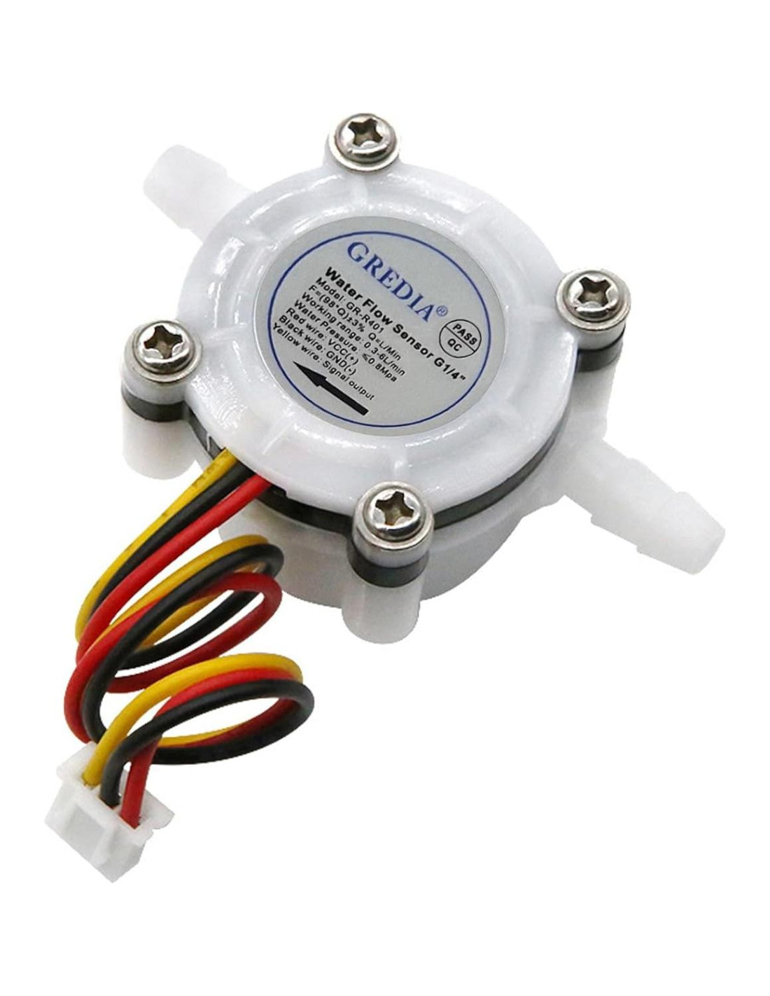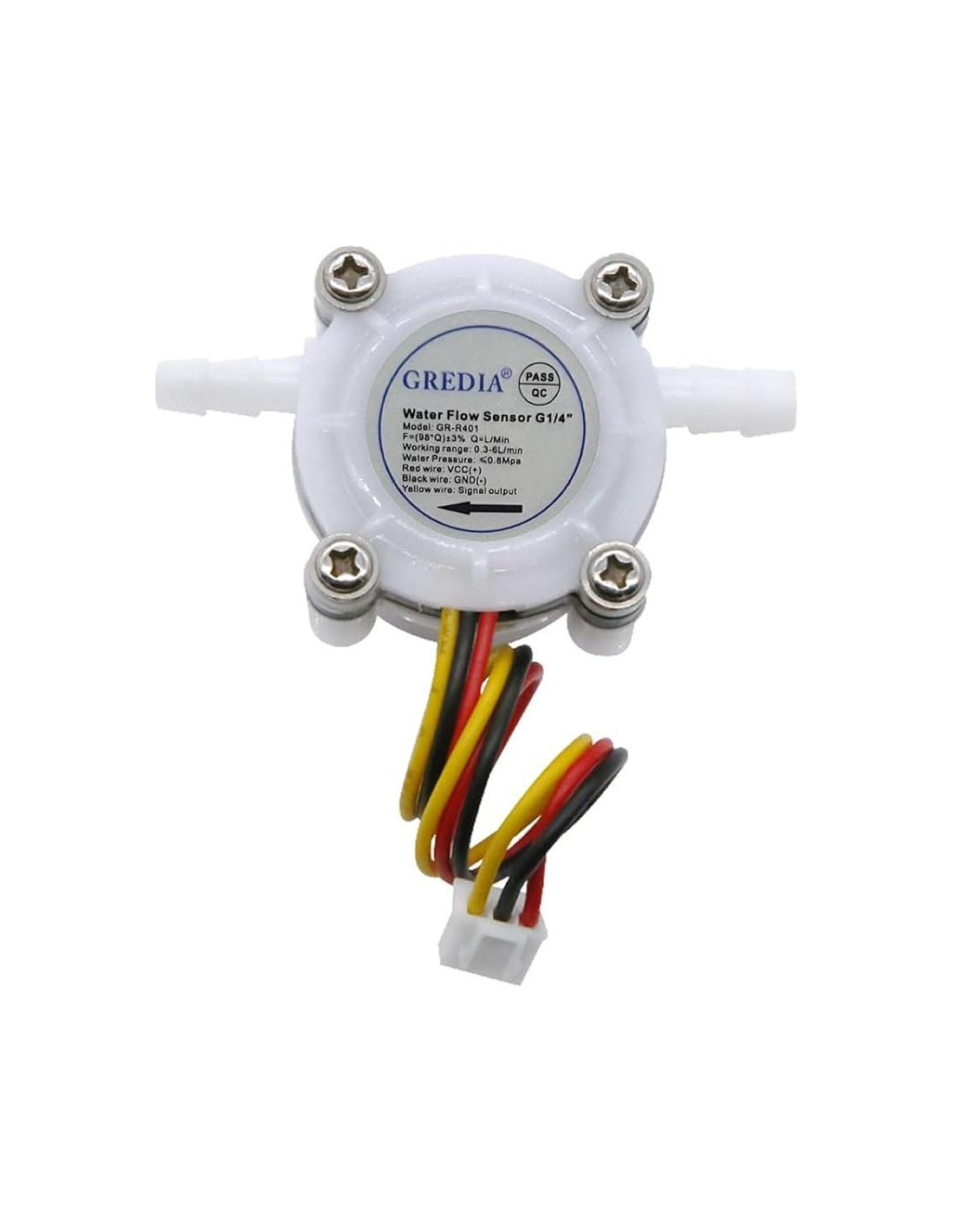 Nuestros productos están bien hechos con buenos materiales y buena mano de obra, control de calidad estricto, garantía en el servicio postventa. El medidor de flujo es ligero y práctico, fácil de instalar. El anillo de sellado hace que la conexión sea firme, el rendimiento de sellado es bueno y se evita el problema de fugas de agua. Más detalles sobre el medidor de flujo: F=(98*Q)+/-3%, Q=L/Min, error: +/-3% Rango de trabajo: 0.3-6L/min Voltaje de trabajo: DC 5-24 V Presión de agua: <0.8Mpa Temperatura del líquido: 0-100C Consumo máximo de corriente: 10 mA(DC 5V) Tamaño: 58mm x 34mm x 26mm (L*W*H) Longitud del cable: 15 cm Referirse al cableado: Cable rojo: VCC(+) Cable negro: GND(-) Cable amarillo: Salida de señal Paquete: 2 x medidor de flujo de 1/4 de pulgada conectar manguera
