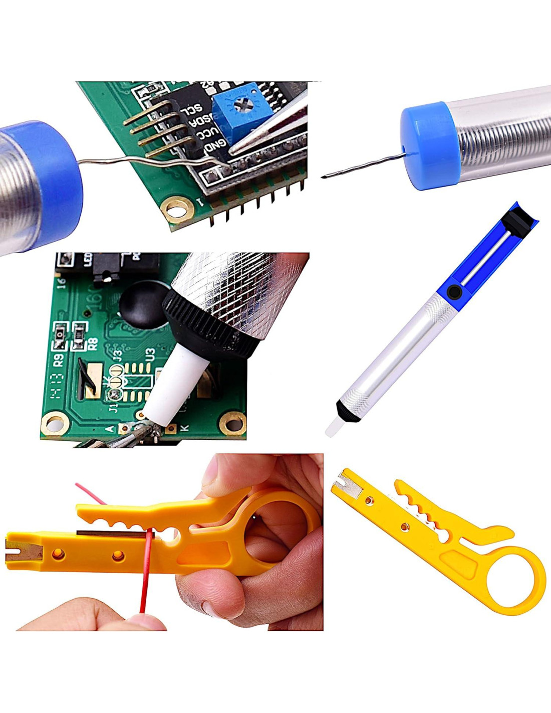 - Más de 14 artículos: soldador con soporte y esponja, alambre de soldadura de 0.8mm, bomba de desoldar/sucker de soldadura, 2 puntas de hierro reemplazables, pinzas, mini pelacables, tubos termocontraíbles más libro electrónico descargable sobre soldadura
