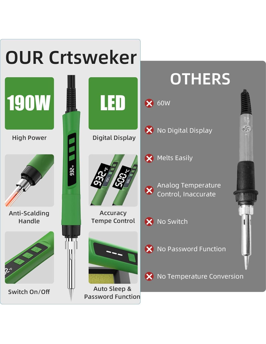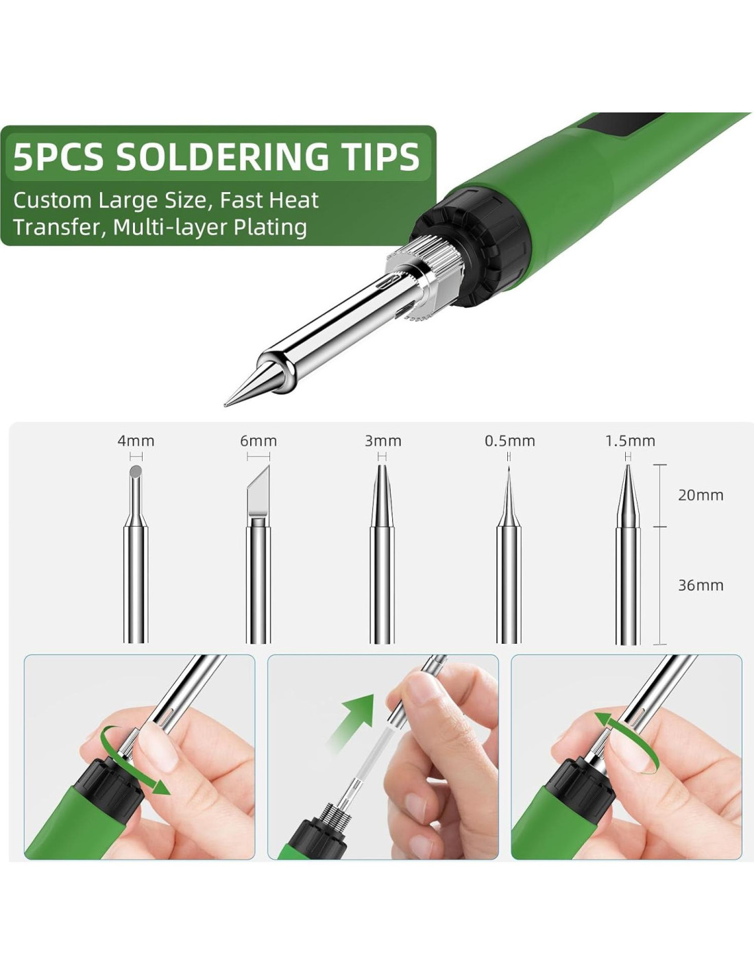 - [KIT DE SOLDADOR DE 190W] : Hecho de núcleo cerámico de alta calidad y 190W de alta potencia, puede calentarse rápidamente a la temperatura establecida, mejorando efectivamente la eficiencia del trabajo. Equipado con puntas de soldadura de alta calidad mejoradas (5 puntas de repuesto), tamaño grande personalizado, recubrimiento multicapa, rápida transferencia de calor, fácil de reemplazar.