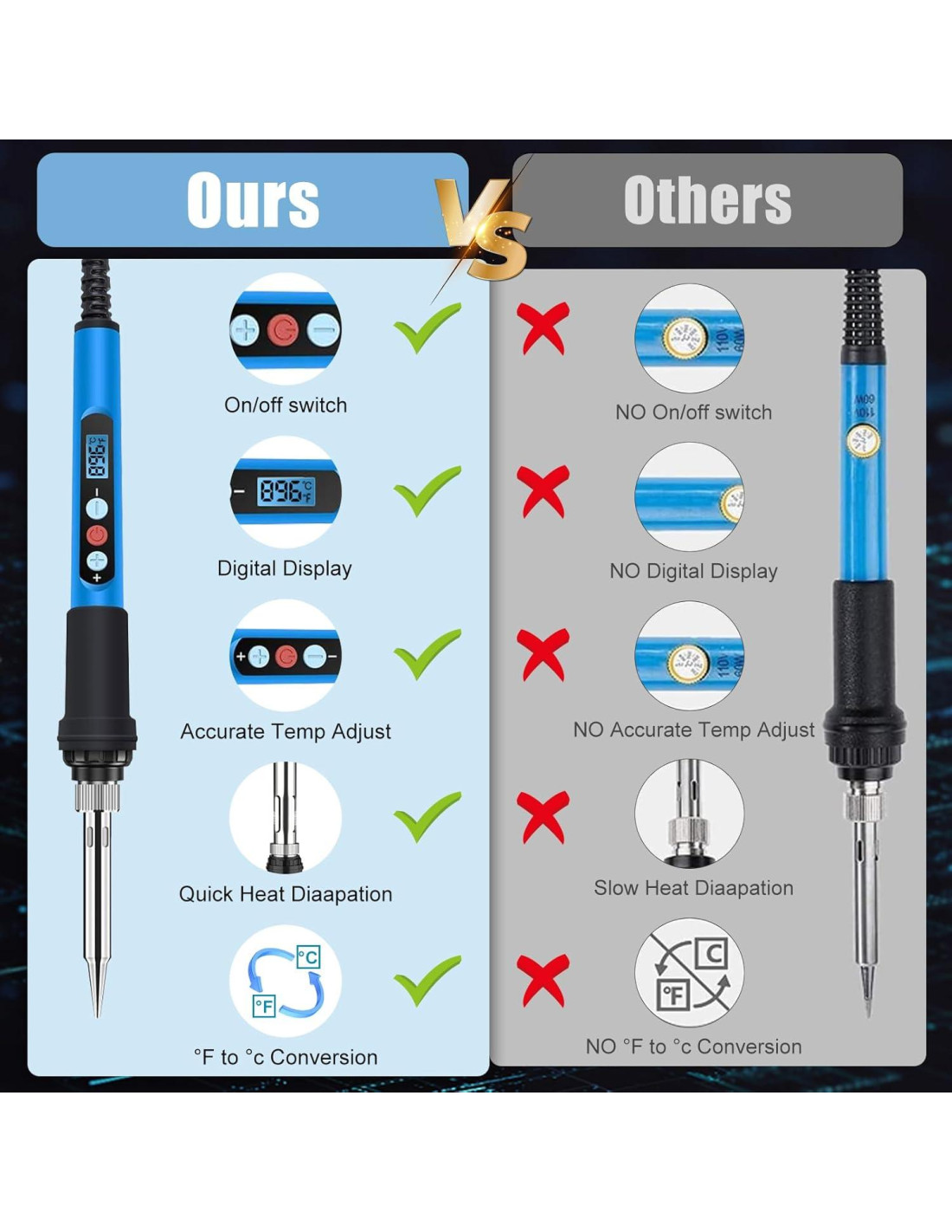 - Diseño Efectivo de Ventilación de Calor: Nuestro soldador digital está diseñado con cuatro orificios de ventilación para una disipación de calor eficiente. El diseño mejorado del tubo de acero ayuda a mantener un mango fresco durante el uso, asegurando comodidad y seguridad mientras trabajas en tus proyectos