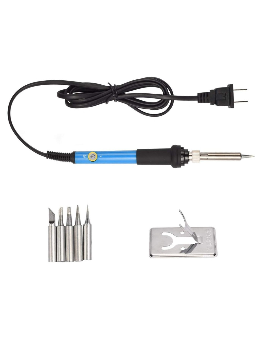 Descripción del producto Color: Azul Voltaje de trabajo: 110V Potencia: 60W Rango de temperatura: 200C~450C Longitud del soldador: 7.0 In (17,78 cm) Longitud del cable: 59.0 In (149,86 cm) Paquete incluye: 1 x Soldador de Temperatura Ajustable (60W 110V) 5 x Puntas de Soldadura Extra 1 x Soporte