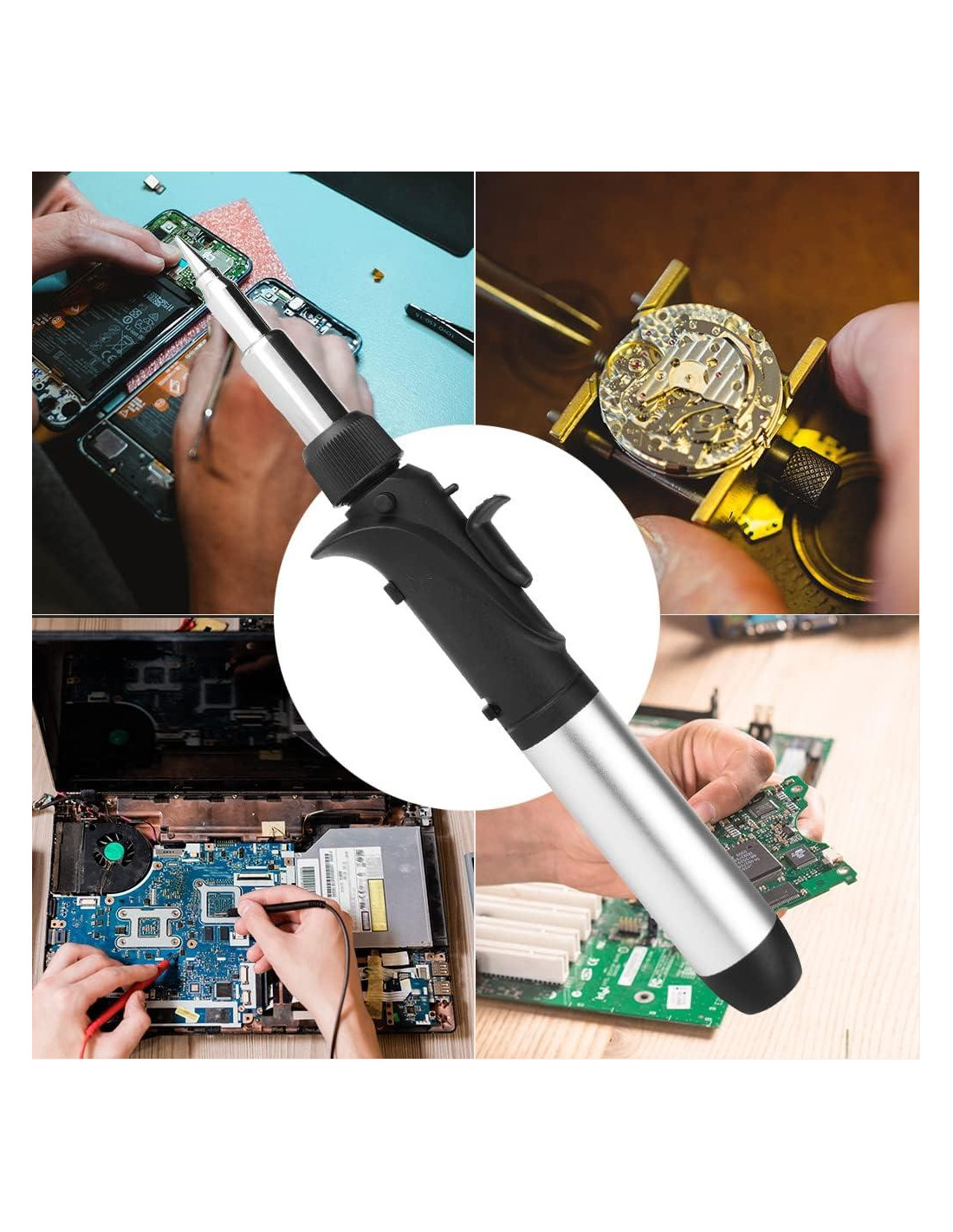 - Diseño Multifuncional - Esta unidad combina un soldador de butano, un micro soplete de gas y una pistola sopladora de calor en una sola herramienta.
