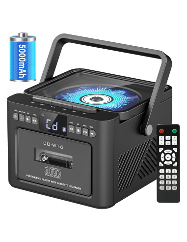 - [Control remoto + Modo de sueño] : Este Boombox con reproductor de CD y cinta viene con un control remoto que soporta una distancia de control remoto de 23 pies. Cuando escuchas en la sala de estar o la cocina, puedes cambiar libremente los modos de reproducción; programas de radio; ajuste de volumen; y otras operaciones. El reproductor de CD Boombox portátil también soporta el modo de temporizador de sueño, cuando estés listo para dormir, establece el tiempo de apagado entre 10-120 minutos, y se apaga automáticamente cuando se acaba el tiempo, duerme plácidamente