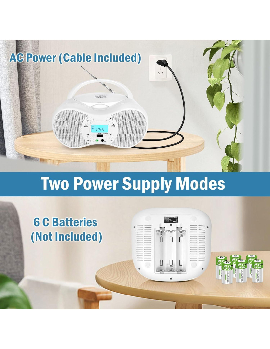 - [Sonido Estéreo con Opciones de Alimentación Dual] Experimenta una calidad de audio premium a través del sistema de altavoces estéreo dual integrado que ofrece un sonido rico y potente con mínima distorsión. Diseñado para un uso flexible, este boombox puede ser alimentado por el adaptador de corriente alterna incluido para escuchar en interiores o seis baterías tamaño C (no incluidas) para entretenimiento portátil al aire libre. Para sesiones de escucha privadas, simplemente conecta tus auriculares usando el conector de audio estándar de 3.5 mm.