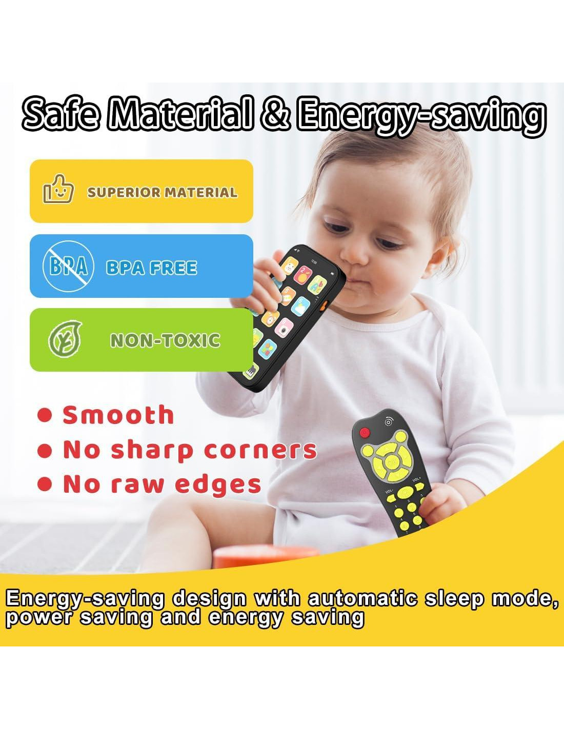 - Seguro para Bebés: Hecho de plástico ABS seguro para bebés de alta calidad, libre de BPA, y no se desvanece fácilmente. La superficie del control remoto para bebés y el teléfono de simulación son suaves, sin esquinas afiladas, bordes crudos, sin daño a la piel de los niños. Perfecto para que tu bebé lo sostenga y juegue. Los juguetes para niños son compactos y portátiles, lo que los convierte en grandes compañeros para el tiempo de juego en casa o en movimiento.