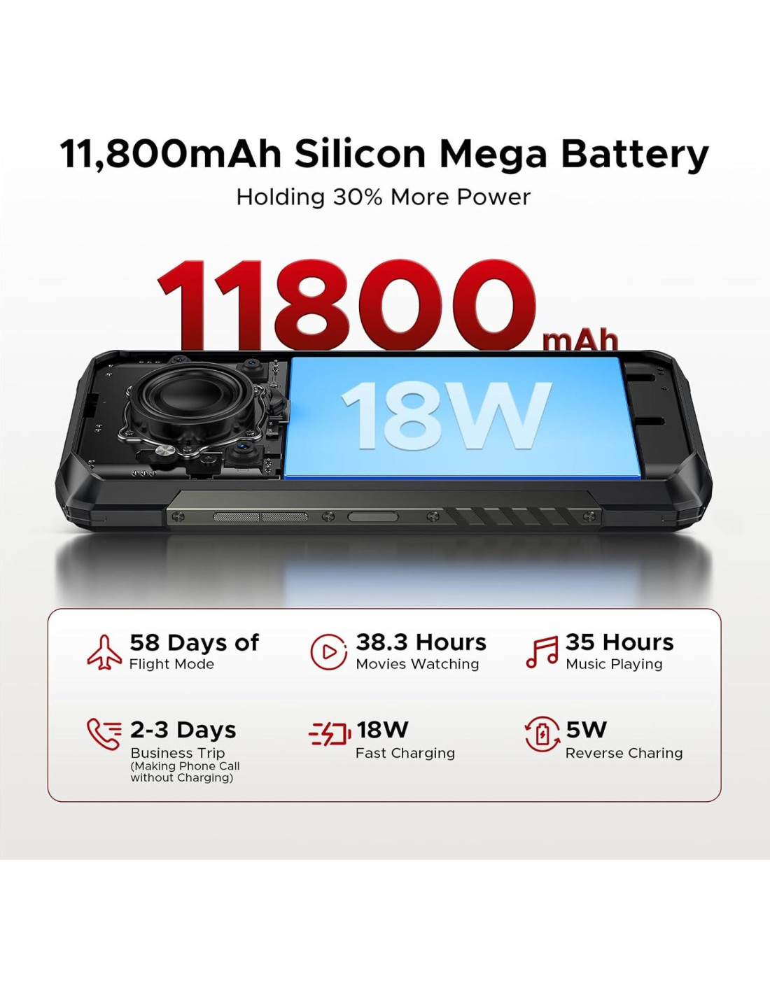 - [Este teléfono celular resistente está alimentado por una batería ultra grande de 11800mAh, que ofrece días de uso sin interrupciones. Con carga rápida de 18W a través de Type-C, puedes recargar rápidamente. Además, la carga inversa OTG permite que este smartphone resistente desbloqueado actúe como un banco de energía para tus otros dispositivos, lo cual es una gran ventaja en emergencias o viajes al aire libre. Ya sea que estés en un turno largo, haciendo senderismo o viajando, el DOOGEE Blade 20 Pro teléfono resistente garantiza energía de respaldo confiable, convirtiéndolo en un verdadero compañero para la resistencia y la aventura.