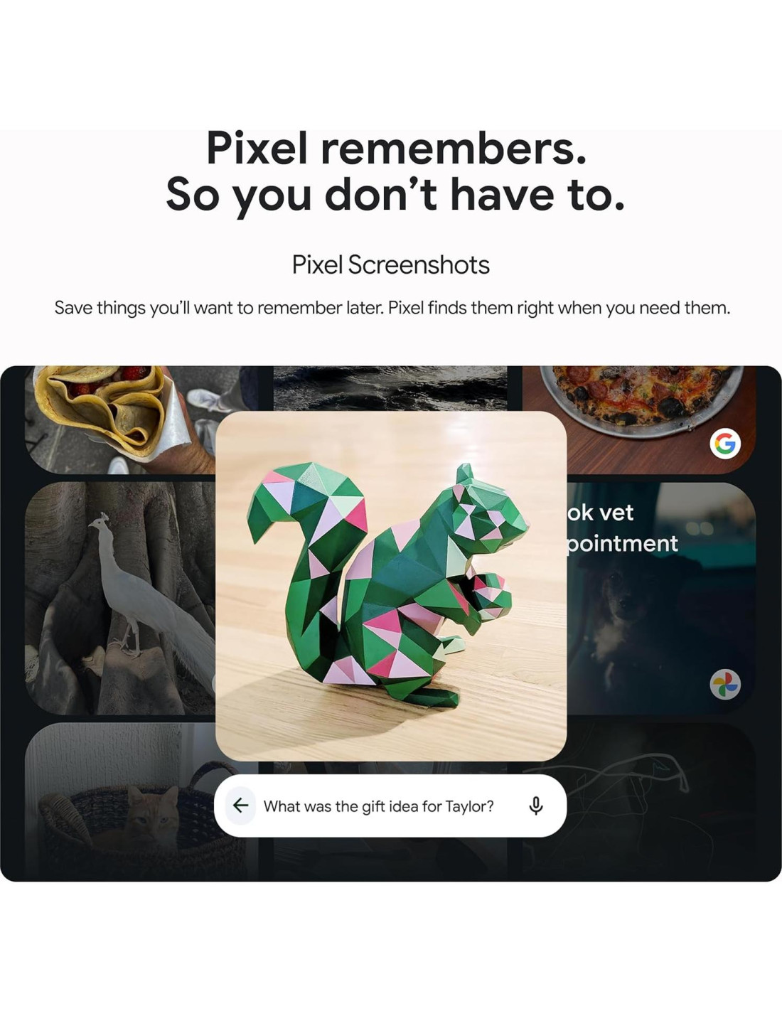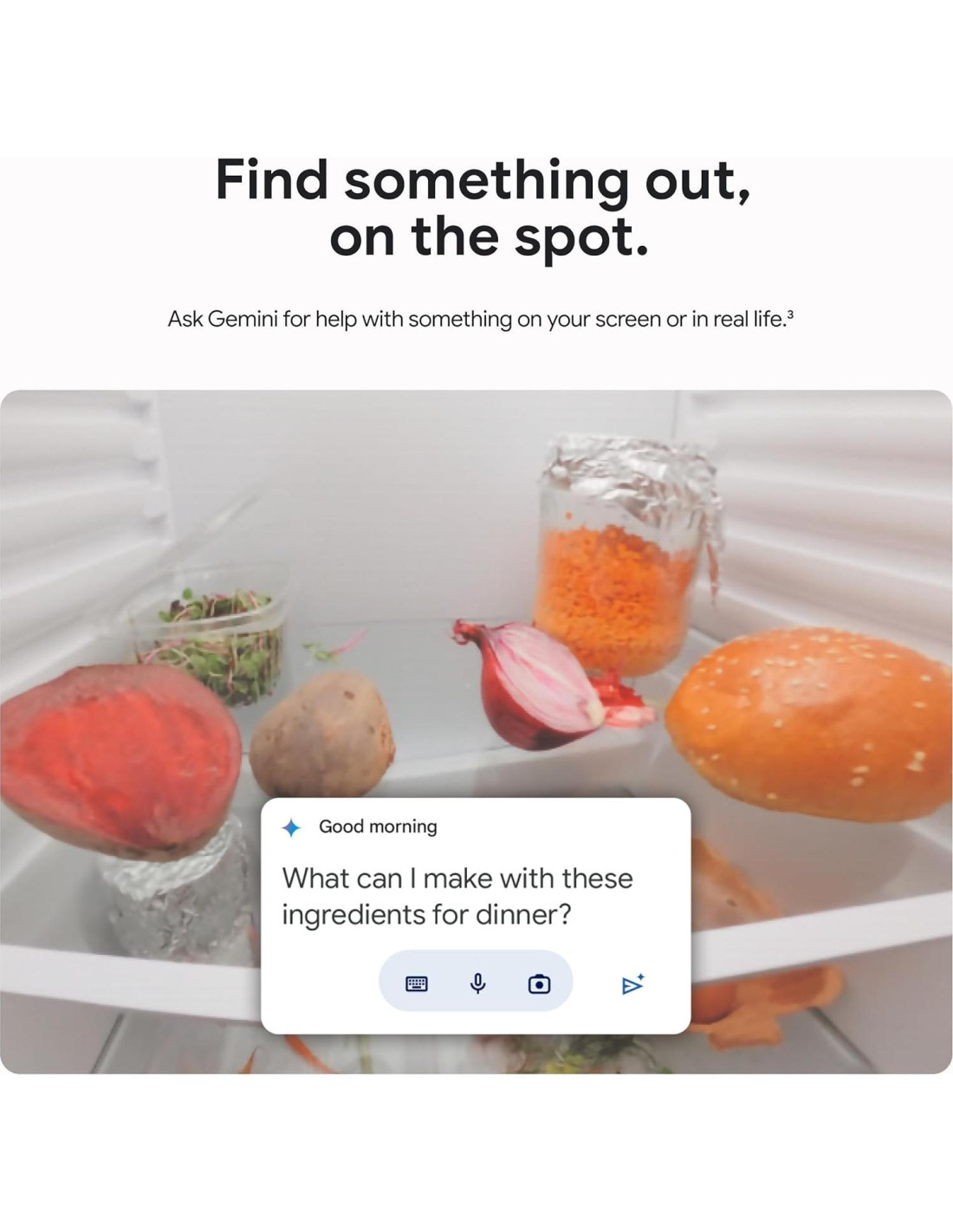 - Obtén más información rápidamente con Gemini, tu asistente de IA integrado; en lugar de escribir, usa Gemini Live; sigue la conversación incluso si cambias de tema o cambias la pregunta; y Capturas de Pantalla de Pixel te ayuda a guardar cosas que querrás recordar más tarde