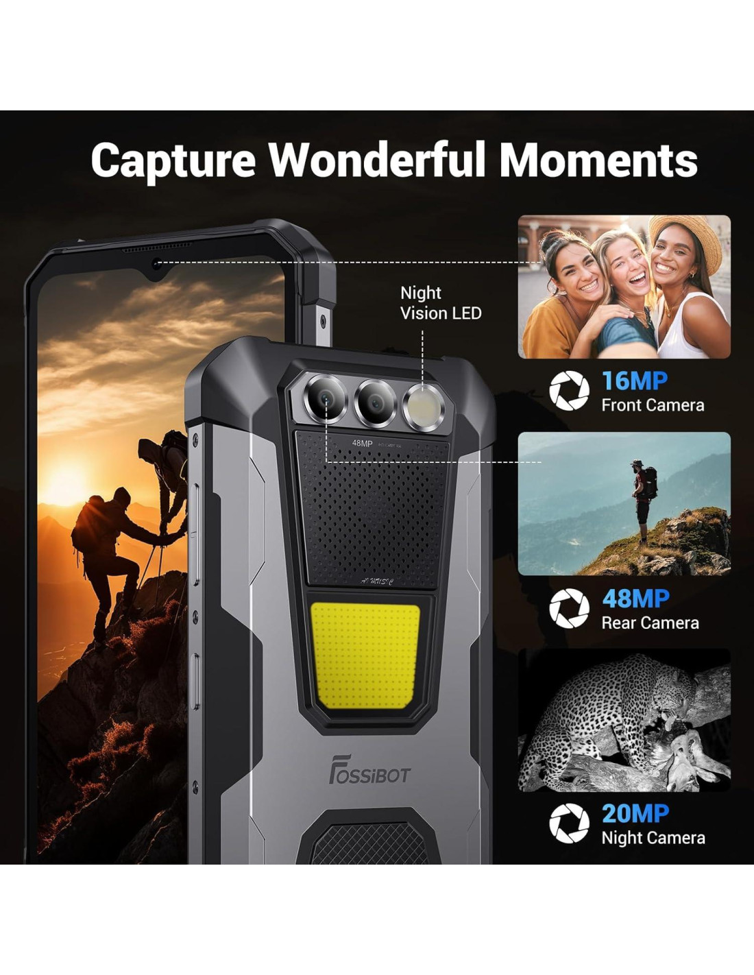 - Pantalla Grande de 6.58" (16.7 cm) & Cámara HD de 48MP+16MP+20MP: El teléfono inteligente resistente FOSSiBOT F106 Pro tiene impresionantes capacidades de cámara. Cuenta con una cámara trasera de 48MP y una cámara frontal de 16MP, asegurando fotos de alta calidad desde ambos lados. Además, viene con una cámara de visión nocturna de 20MP para capturar imágenes claras en condiciones de poca luz. Teléfono resistente al agua equipado con una pantalla de 6.58" (16.7 cm), asegurando que cada experiencia visual se represente en colores ricos y vibrantes para mejorar aún más tu inmersión. Imágenes más nítidas y detalladas son más que solo vislumbres de la vida.